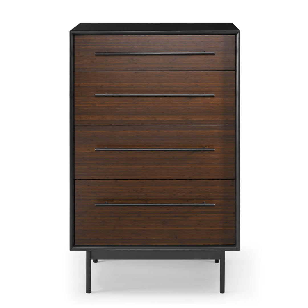 - Product Copy: Create a clean, sophisticated look with Greenington’s Park Avenue bedroom collection. The sleek modern design and simple clean lines of the four drawer Park Avenue high chest features a craftsman-built frame made from solid bamboo, lacquered in a matte black finish on a strong steel base. Black steel accents complement dark Ruby bamboo drawers and black lacquer surfaces. Four wide solid bamboo drawers built using English dovetail joinery sits on under-mounted, soft-close glides for easy opening and closing. Each drawer is faced in dark Ruby solid bamboo material, with a contrasting interior of warm caramelized solid bamboo, and accented with a slim black steel drawer pull. Sustainable and earth friendly, Ruby is not a surface stain, the color is the result of an innovative new process using earth friendly heat and steam, to entirely transform the solid bamboo material into Ruby’s deep red color. Each Park Avenue high chest is beautifully finished on all four sides and ships professionally assembled. Discover the expert craftsmanship packed into each piece of Greenington bamboo furniture. Made using an eco-friendly, renewable resource harvested from fully sustainable and rapidly growing forests. Features: • Crafted in 100% solid Moso bamboo • No plywood, particle board, or MDF • Earth friendly, sustainable resource • 20% harder than Red Oak • Fully assembled nightstand and chests • Beautifully finished all the way around • Solid bamboo drawer box with English dovetail • Under mount, soft closing drawer glides • Sleek matte black drawer handles • Tough metal to metal connecting hardware
