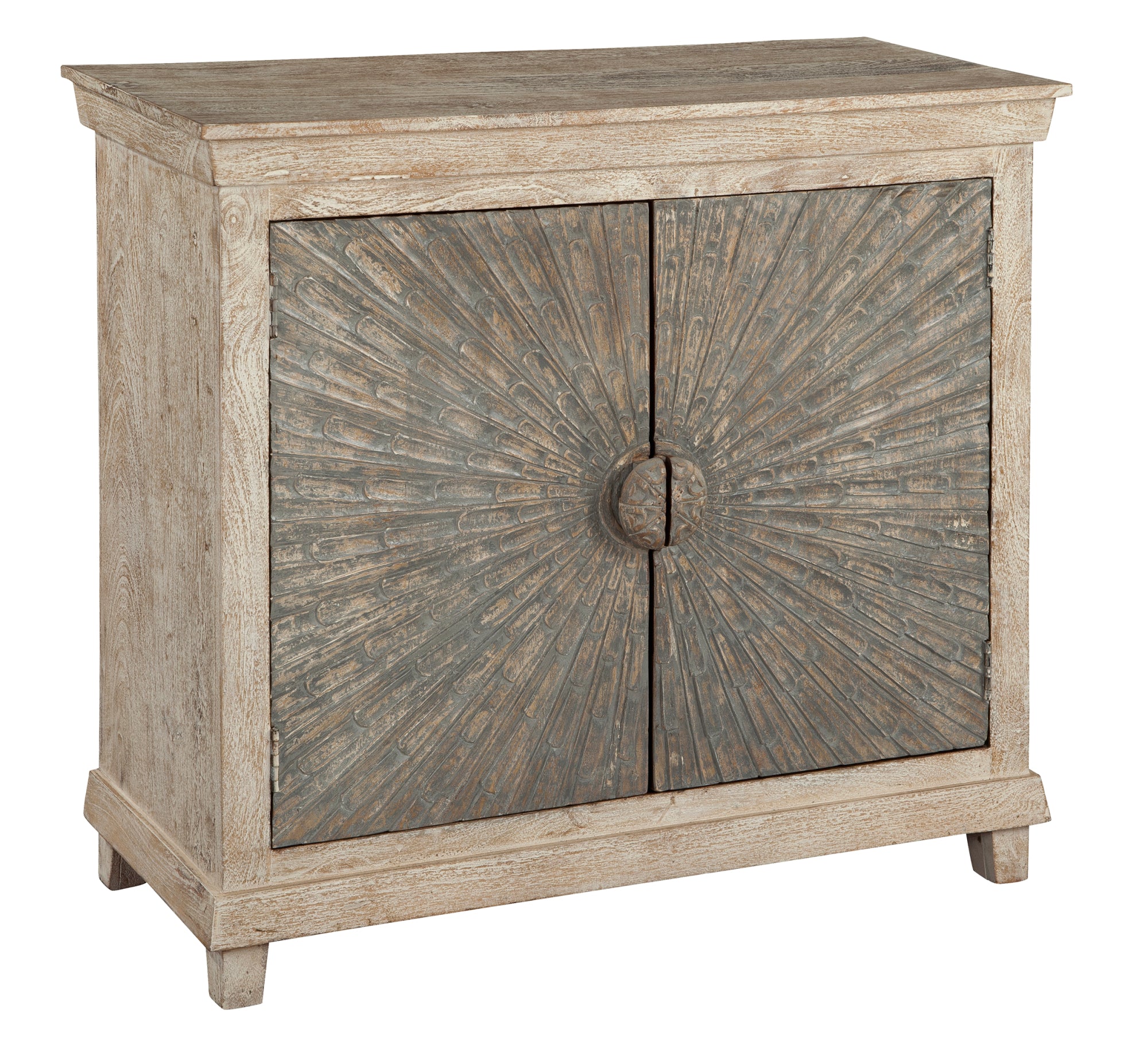 - Two door chest with highly detailed carving that appears to radiate from the center cup pulls.