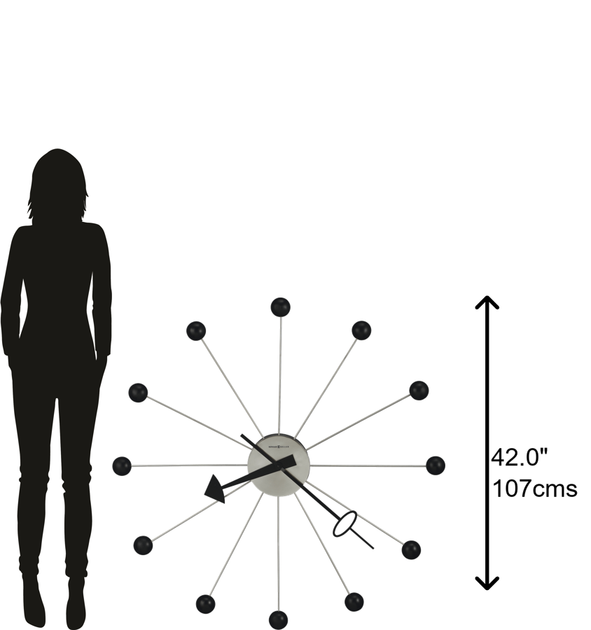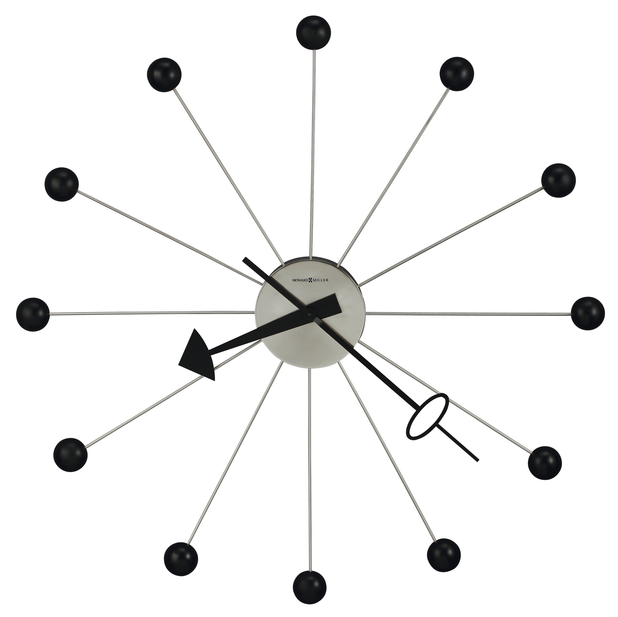 - A throwback to the 1940s, this modern wall clock is the perfect piece to add notable flair to your home or office. With a stunning finish and bold styling, you will fall in love with the nostalgic design of this unique wall clock. Retro Design: This retro wall clock is an adaptation of a classic 1940s George Nelson design. The beautiful styling of the piece makes it a charming addition to any room. Pair with other vintage and retro pieces to create a one-of-a-kind style. Unique Finish: The center of this unique wall clock is finished in brushed nickel and is surrounded by 12 black satin balls on nickel-finished rods. These sunburst style rods make this a fun piece that stands out in any room. Detailed Styling: No detail was left unnoticed in the creation of this modern wall clock. Black satin-finished hour and minute hands complement the rest of the clock&rsquo