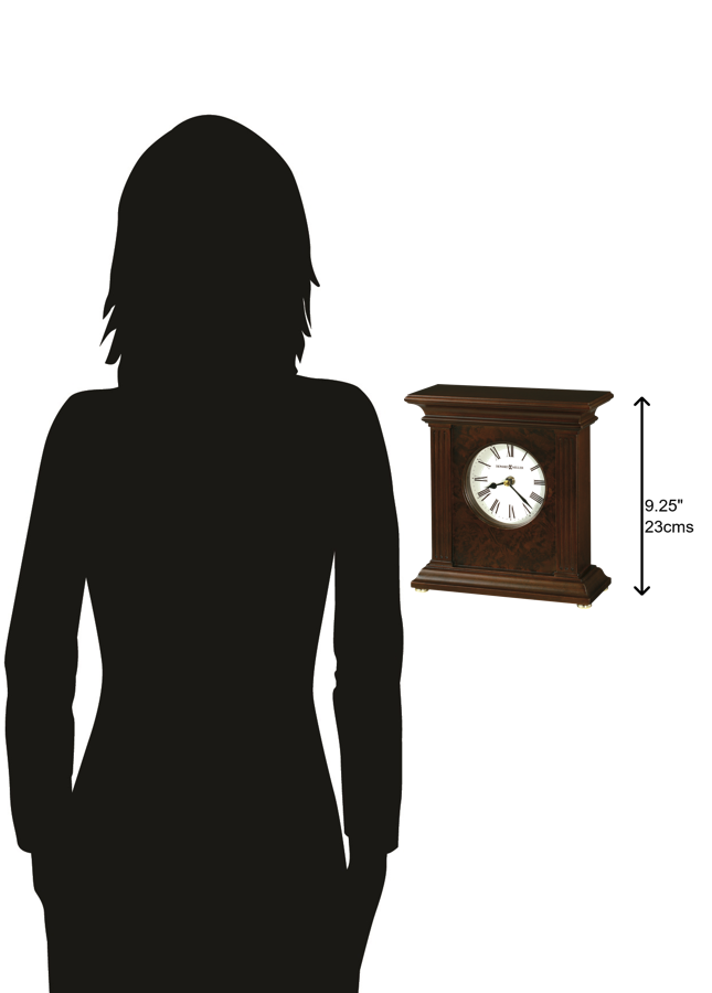 - The case features a camphor burl front panel, fluted side column detailing, an off-white dial with black Roman numerals, and brass-tone bun feet.
