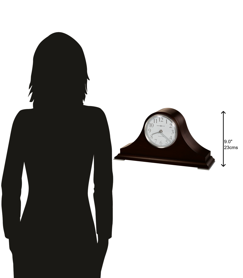 - s as much a statement piece as it is a timepiece. It promises to endure for decades, with its solid construction and premium materials. Set atop the mantel, it presides over the room with a sense of understated grace and elegance. Dramatic Beauty: A rich shade of Black Coffee sets this tambour-style clock apart from the rest. At the base are nickel-finished metal feet to safeguard the bottom, while the sharp white dial is finished with nickel-finished Arabic numerals that are raised and embossed for a more striking appearance. The minute and hour hands, along with the bezel, are also finished in nickel, while a black minute track provides a subtle contrast. The dial features a convex glass crystal for protection. Timely Operation: The single-chime movement plays Westminster chime and counts every hour. It shuts off automatically between 10:01 pm and 5:59 am. Quartz Movement: Quartz/Westminster, battery-operated movement requires three AA batteries. Howard Miller: Founded in 1926 and still family-owned in its third generation, Howard Miller is the world&rsquo