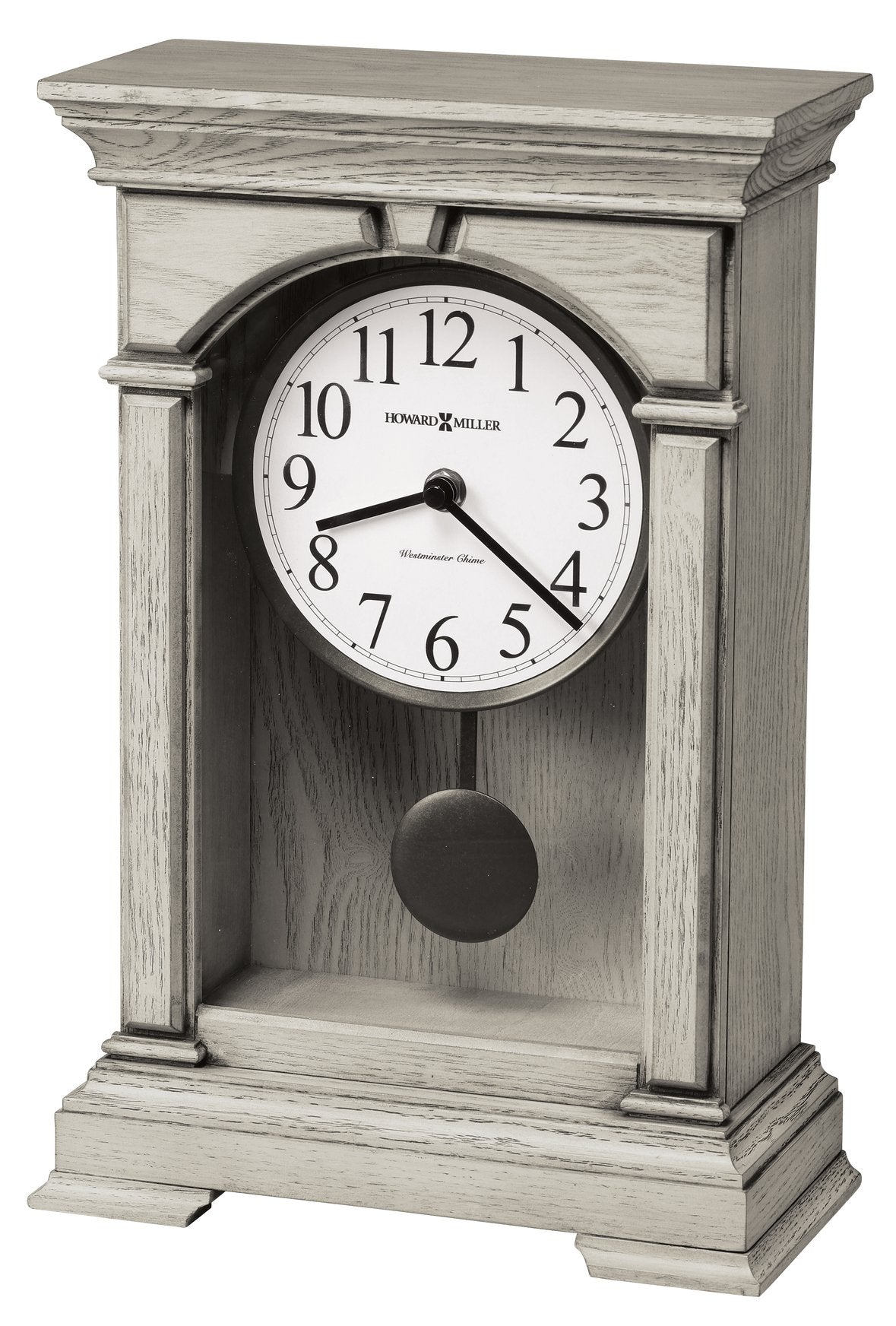 - Pendulum mantel clock with a white-gray finish on select hardwoods and veneers and flat glass panel.