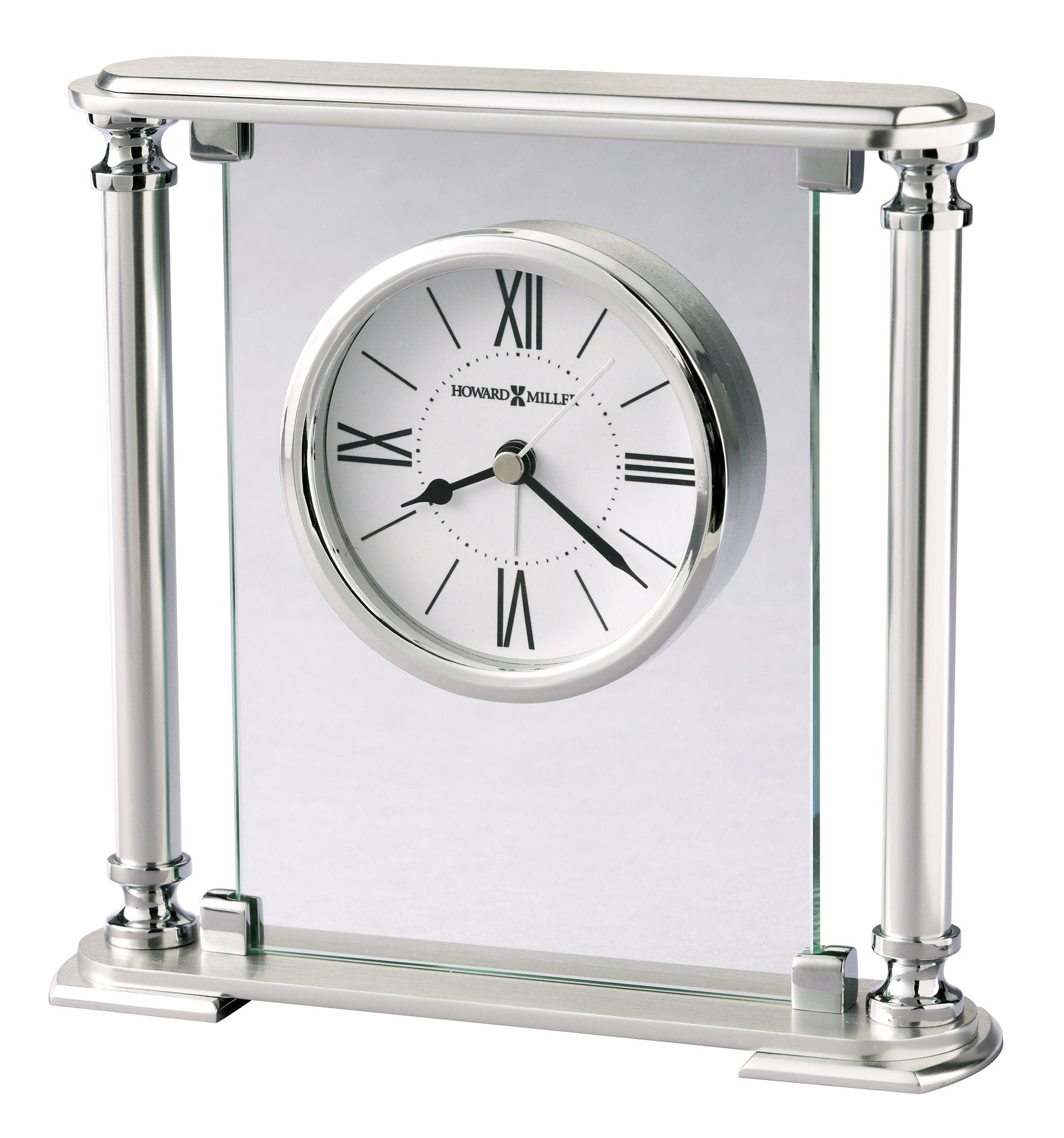 - Metal tabletop clock with brushed silver finished top, base, and feet with polished silver edges and two polished silver columns with caps.