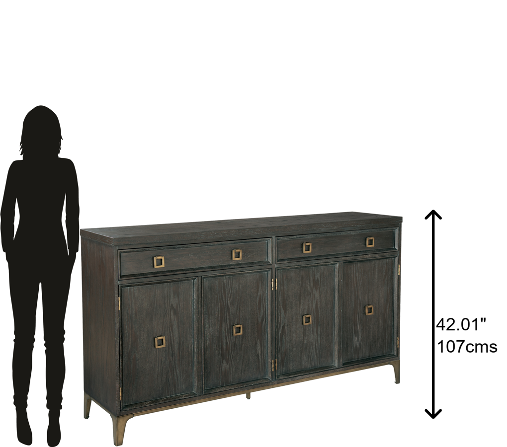 - Four oak doors beneath the drawers each feature a beveled moulding frame and a single block O pull in the center.
