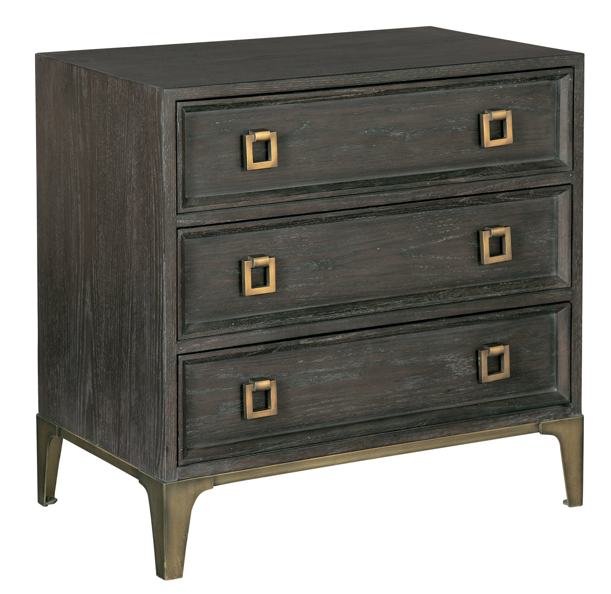 - Each drawer front features a beveled moulding frame with two cast metal block O pulls in antique brass.