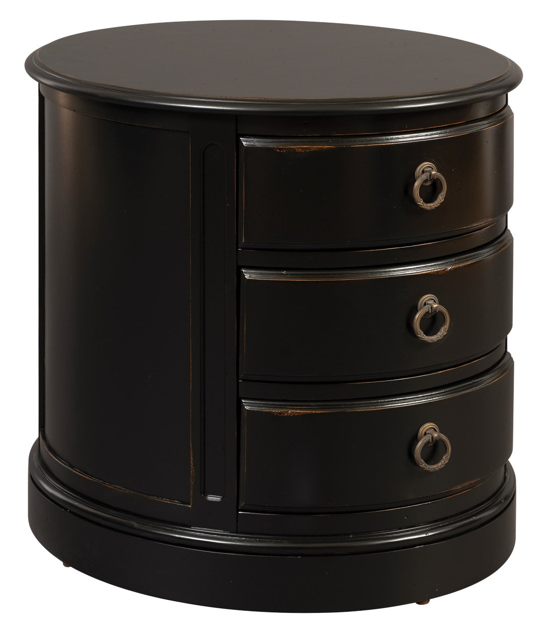 - Oval drum chairside chest with three drawers and circular drawer pulls.