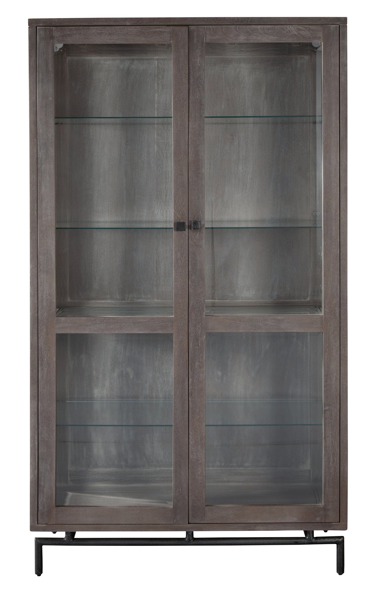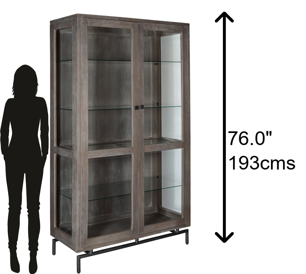 - Display cabinet of solid mango has three adjustable and one fixed glass shelf with an interior puck light to show fine dinnerware and collectibles.
