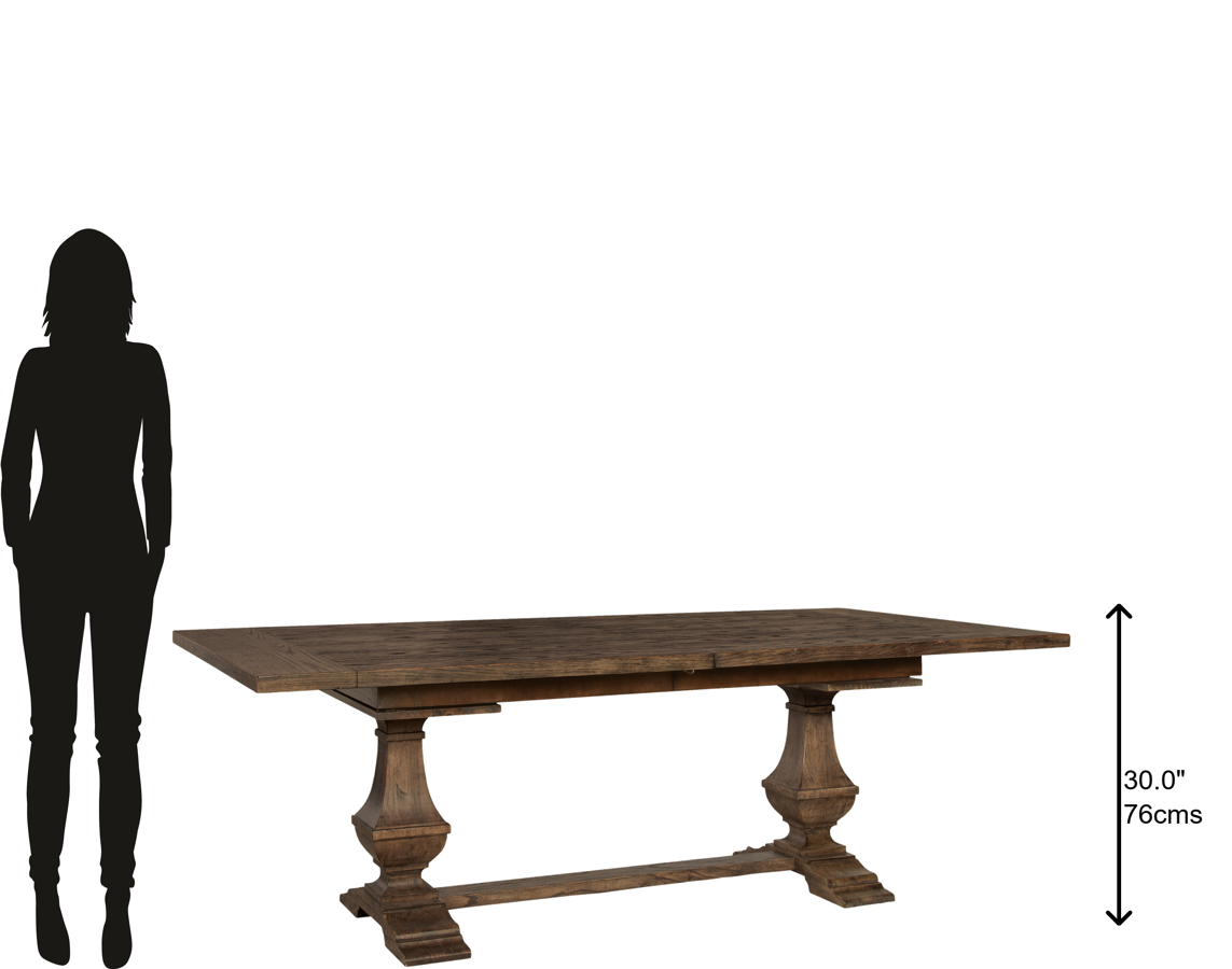 - Dining table with a 1-1/2" top of oak veneer and mindi solids supported on four carved bulbous pedestals mounted to a trestle base.