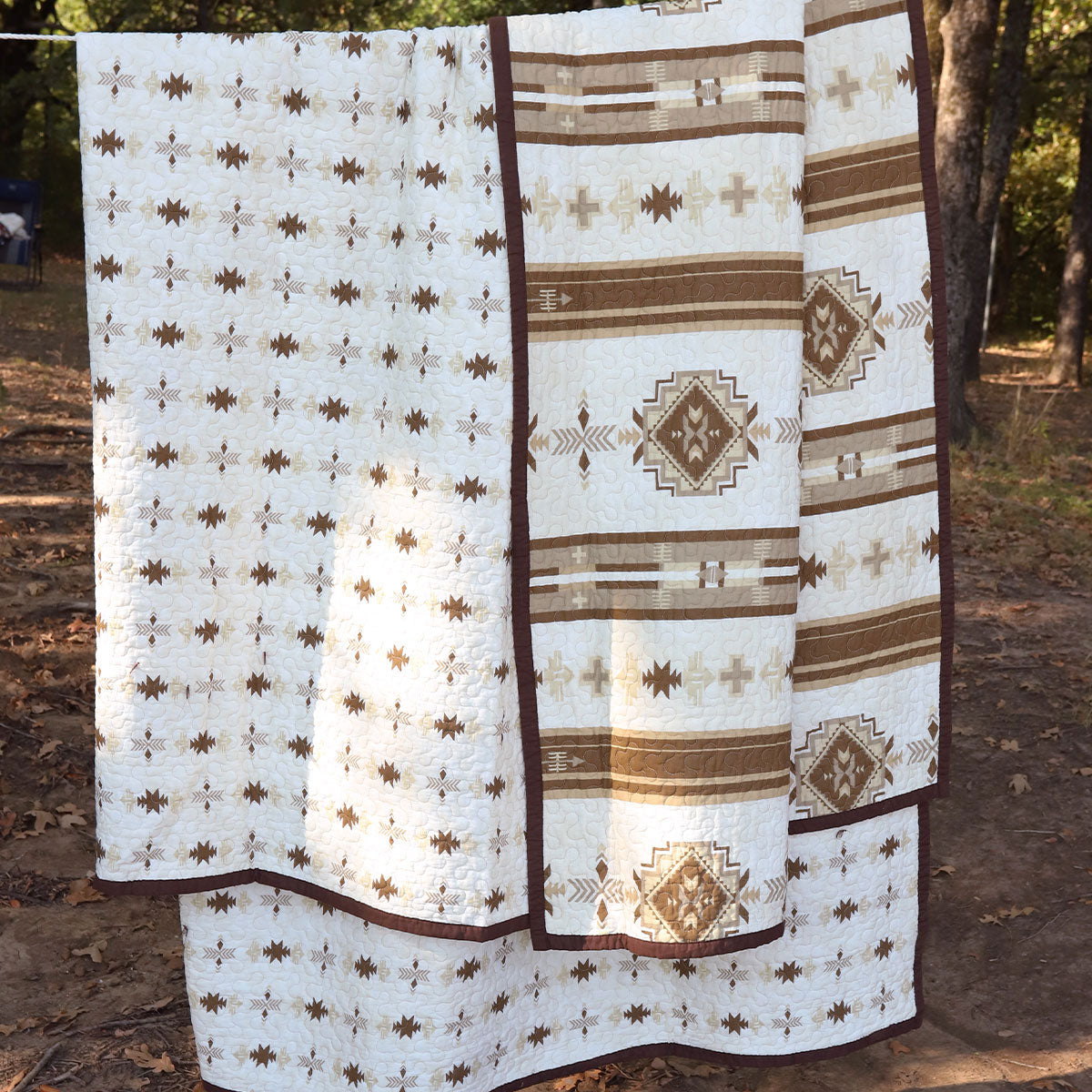 Bring a calming Southwestern charm to your bedroom with our Dakota Reversible Quilt Set's striking geometric themes and neutral palette. Echoing Native American design, Dakota showcases varied horizontal stripes, arrow motifs, and diamond patterns in earth-tones of taupe, brown, and tan. Coordinate with our Dakota pillows and shams to complete a rustic or Southwestern-inspired bedding ensemble.