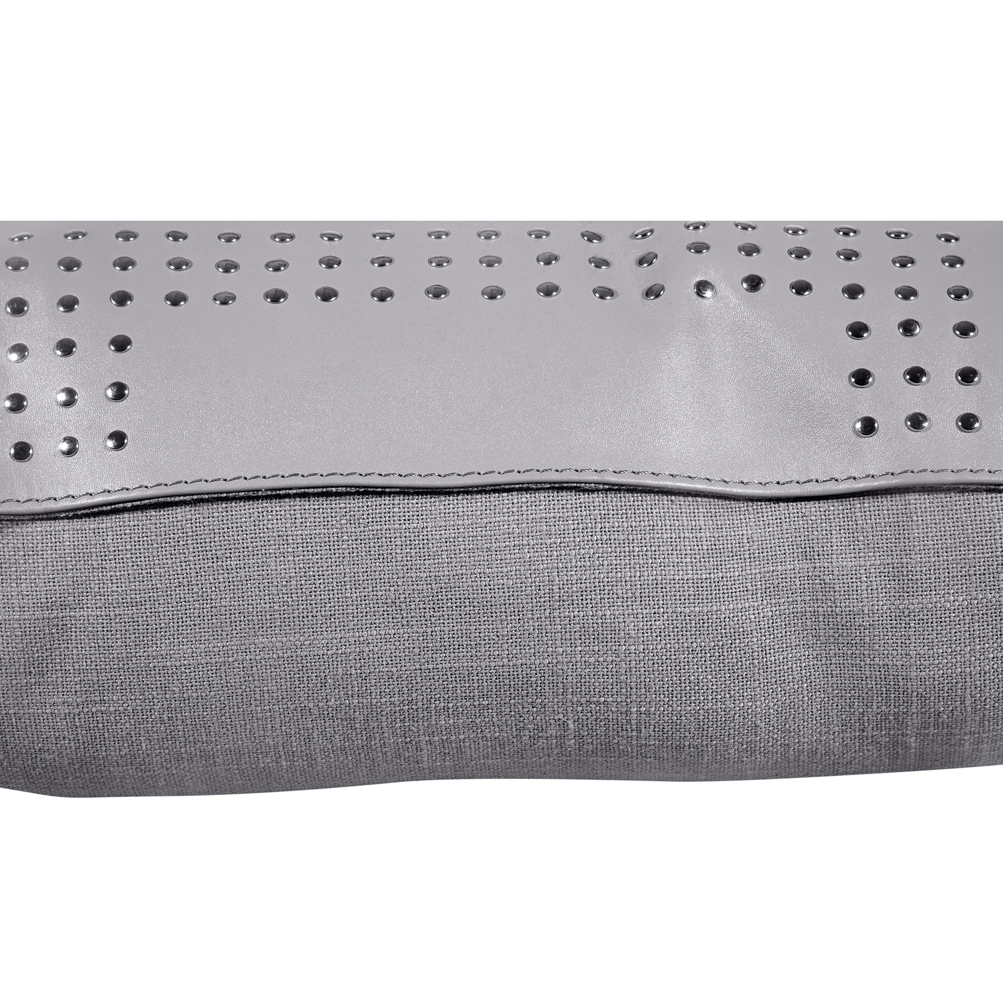These genuine leather pillows instantly add that extra chic element to throw any bed set over the edge. Whether you are going for transitional, contemporary, or most definitely western, they will elevate and inspire the whole look. This particular pillow works perfectly in a contemporary setting with its smooth grey leather and studded pattern, embedded in for durability. 20x20. Dry clean only. Imported.