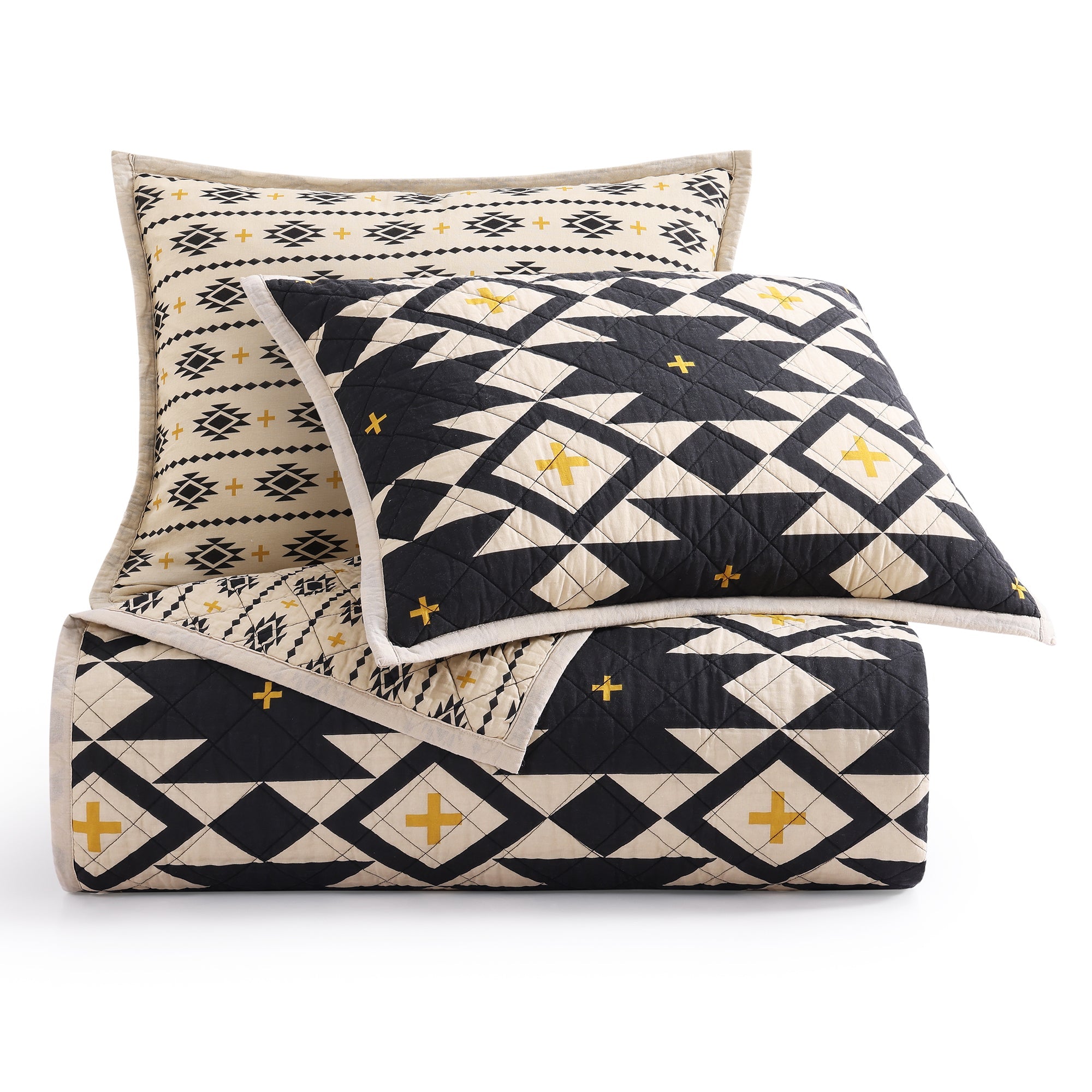 Transform your bedroom into a serene desert oasis with our High Desert Reversible Quilt Set. Inspired by the breathtaking Southwestern landscape, this quilt set combines rustic elegance with modern design, featuring bold geometric patterns that evoke the spirit of the high desert. The versatile reversible design allows you to easily switch up your décor—choose the striking darker side adorned with large geometric shapes for a dramatic look or flip to the lighter side with smaller motifs for a more subtle ambiance. Crafted from 100% high-quality washed cotton, this quilt set is not only visually appealing but also offers a soft and lightweight touch, making it an ideal choice for all seasons.