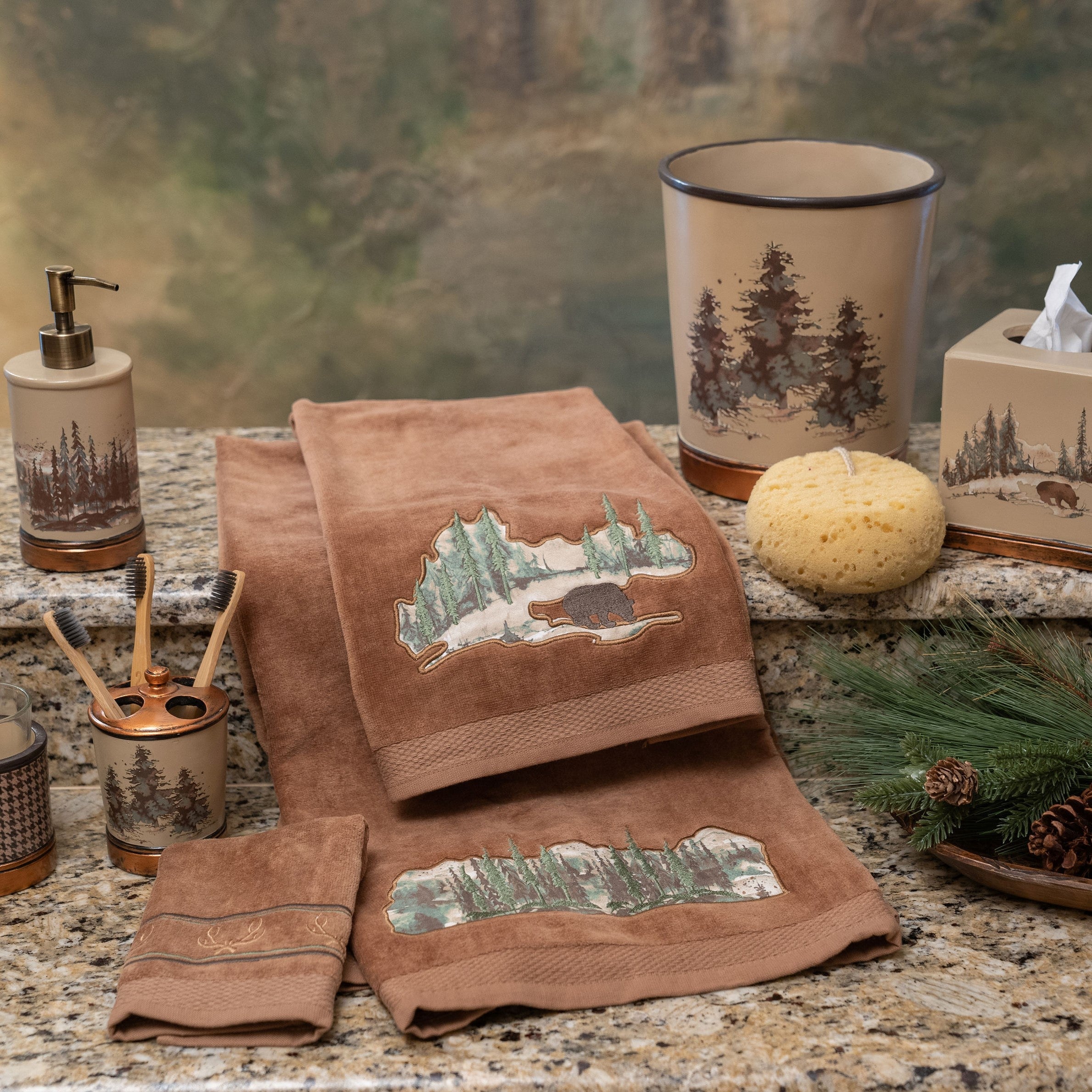 Inspire rustic chic in your bathroom with our Joshua Rustic Bathroom Accessory and Towel Set. Capturing the charm of cabin living, this set showcases scenic pine trees and wildlife motifs in a warm, earthy palette. Coordinate with other pieces in our Joshua Collection to create your modern rustic lodge home. Items in this set can be purchased separately.
