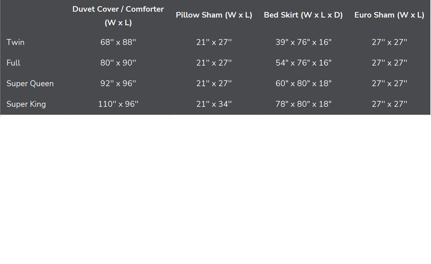 Duvet Cover: 110"W x 96"L; Pillow Sham: 21"W x 34"L