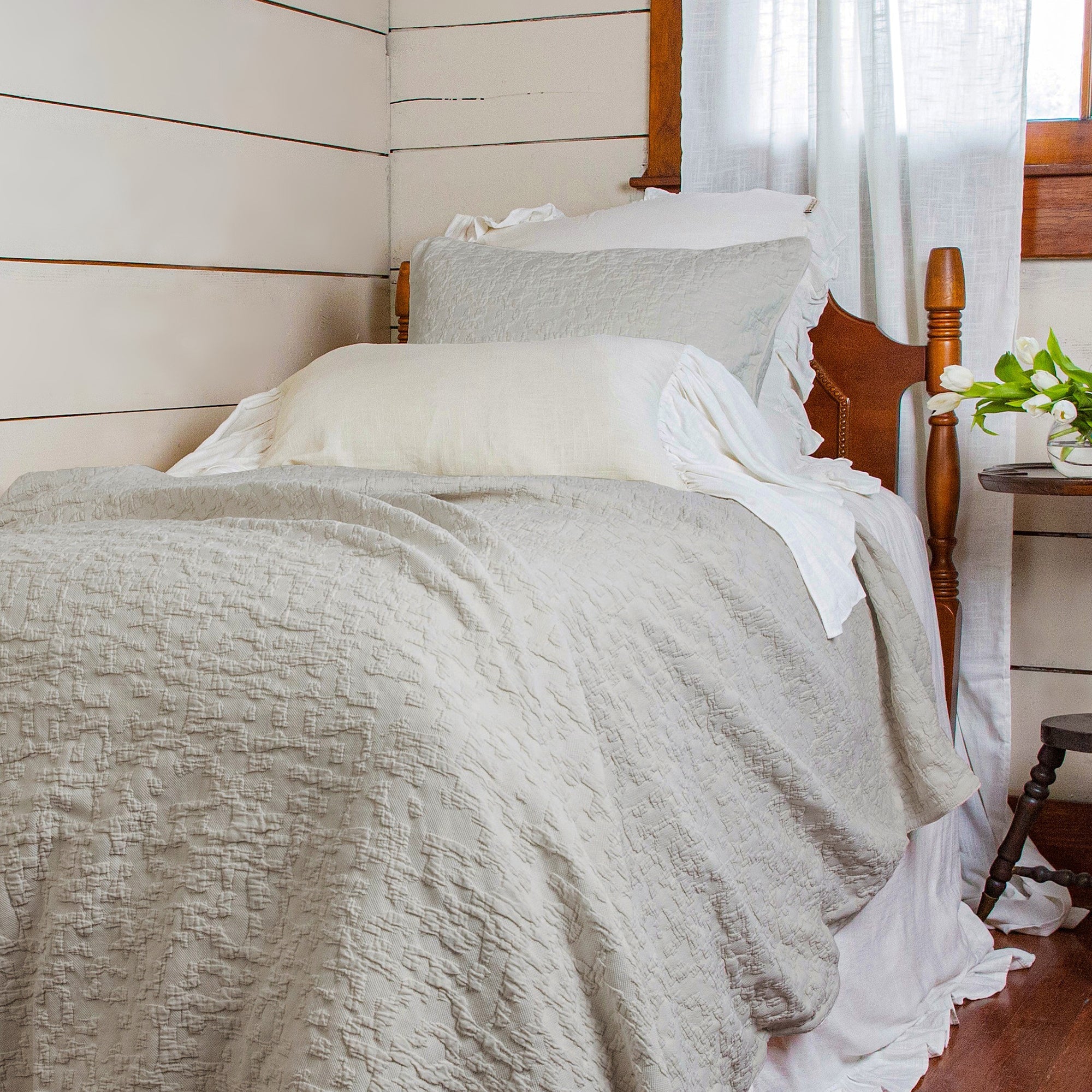 Porto Matelassé graces your bed with the textural beauty of abstract matelassé. Timeless and effortlessly elegant, matelassé presents a supple, rich tactile feel and soothing warmth-without the bulk. This set comes in vintage white and light taupe to match a variety of styles and palettes, creating a versatile classic or traditional base for your bedroom ensemble.