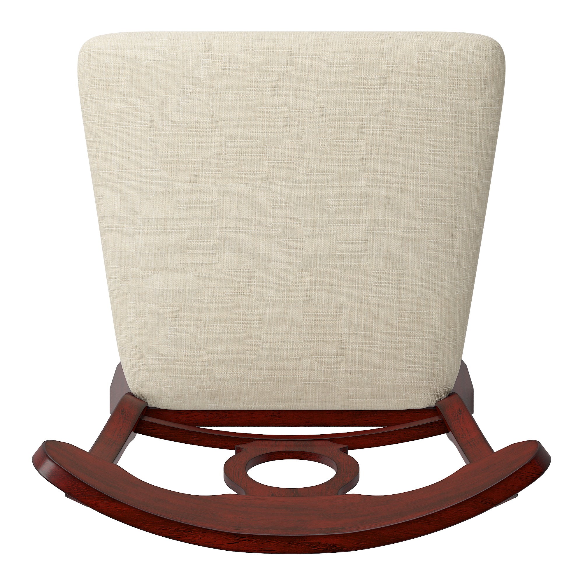 - Features a padded seat, beige fabric upholstery, and footrest for added comfort