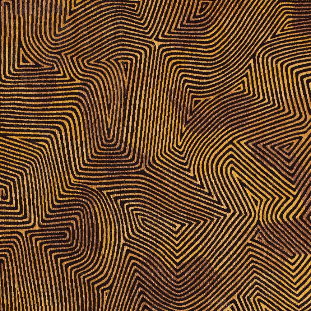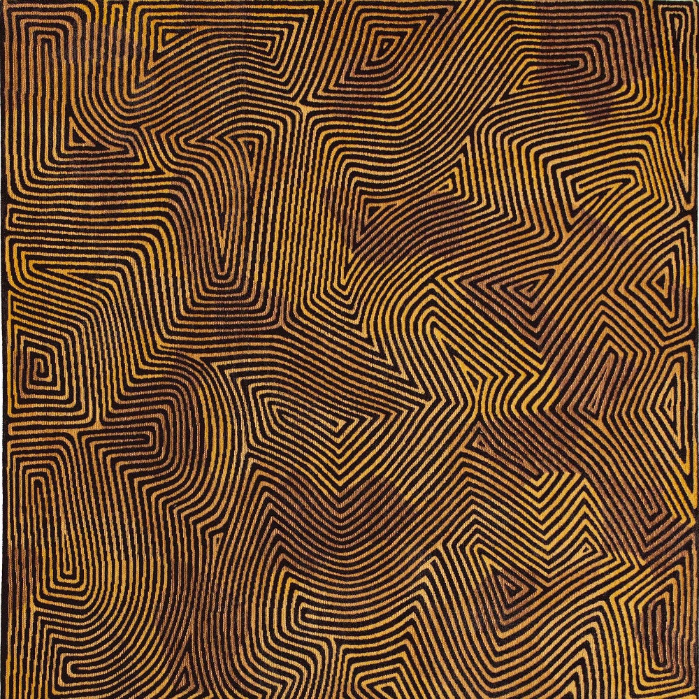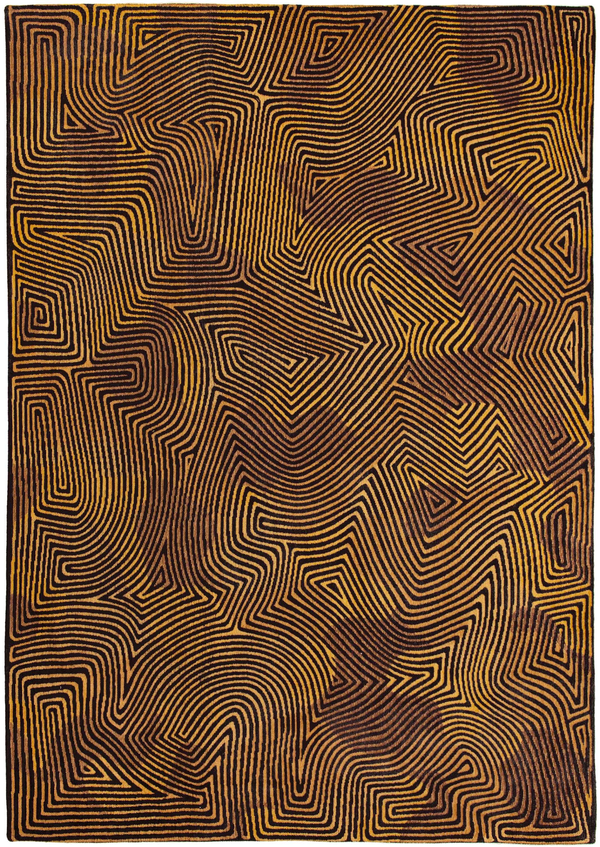 - Modern style area rug with black and gold coloring.