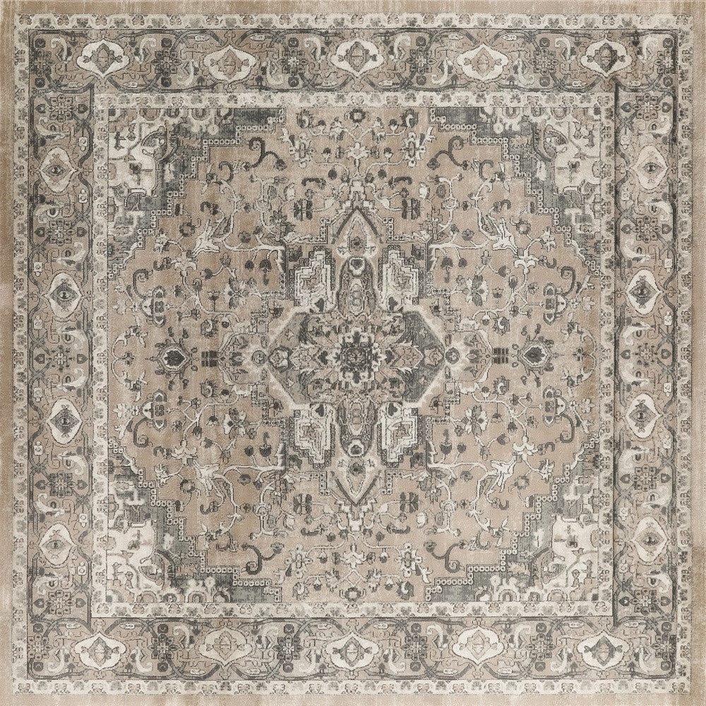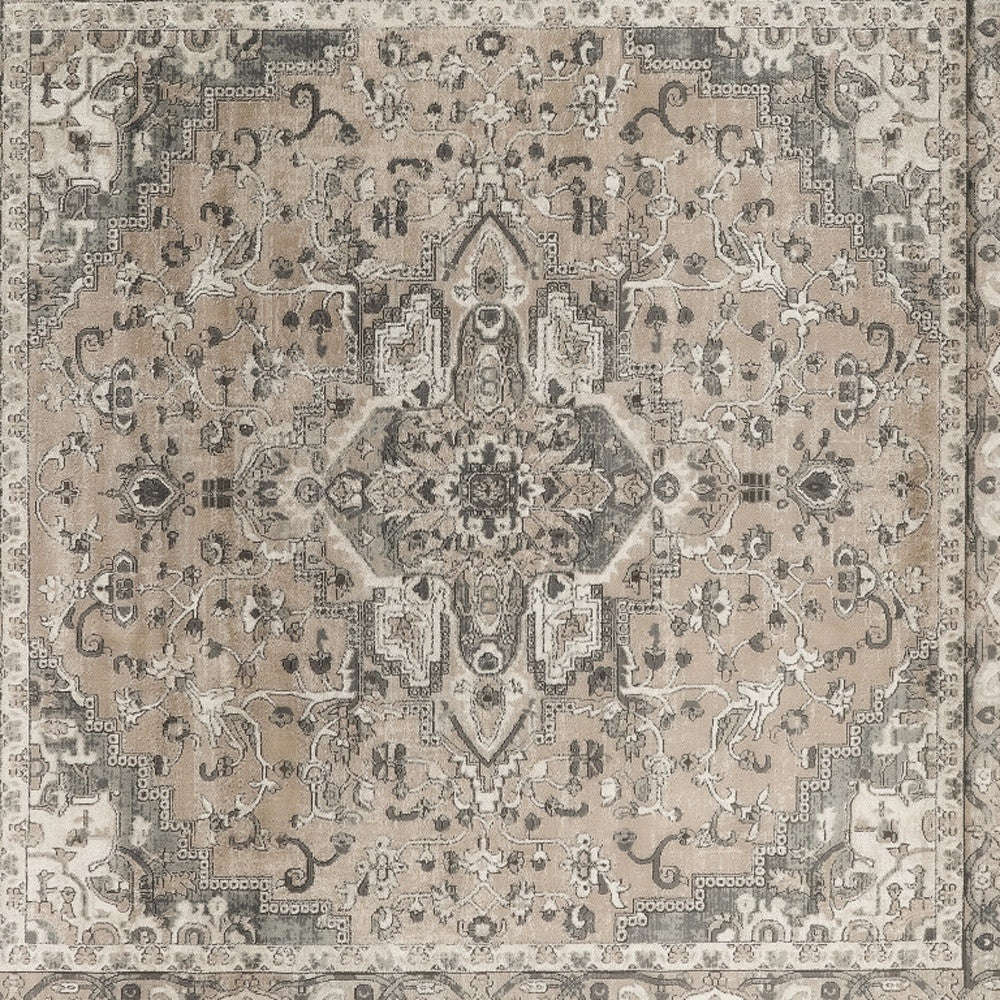 - Machine-made area rug with a blend of polypropylene and polyester in beige and gray for a traditional style.