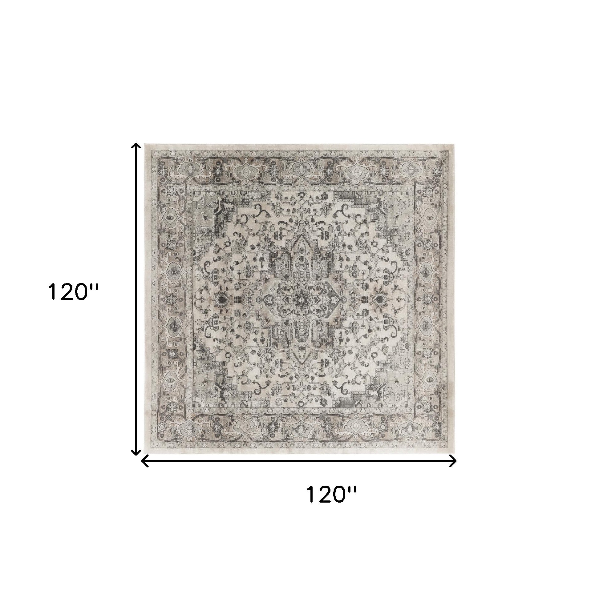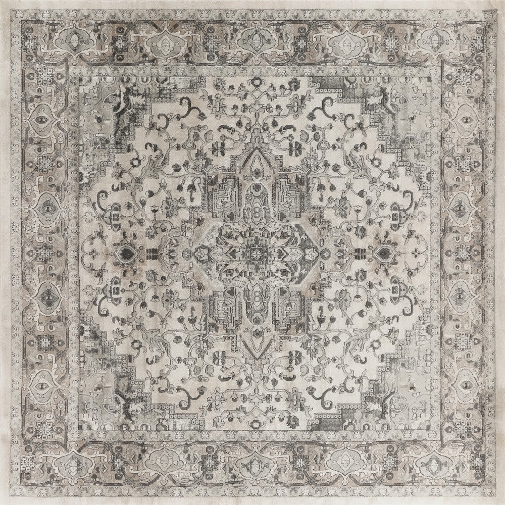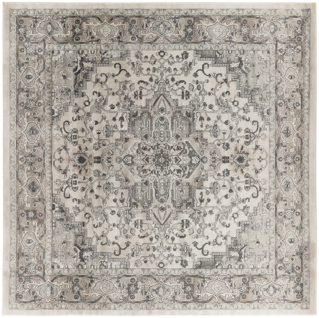 - Elegant gray and ivory traditional area rug crafted from a durable polypropylene and polyester blend for easy care.
