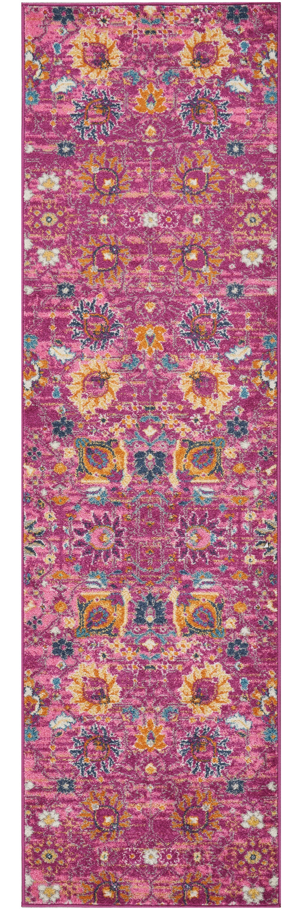 - Pink field adorned with a bright floral pattern