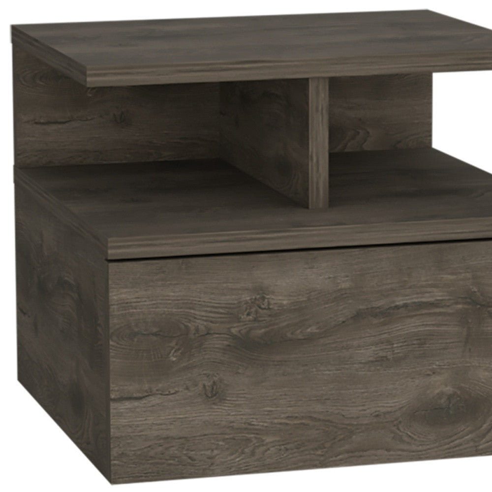 - Modern and unique in design, this floating shelf nightstand requires wall mounting and does not touch the ground.