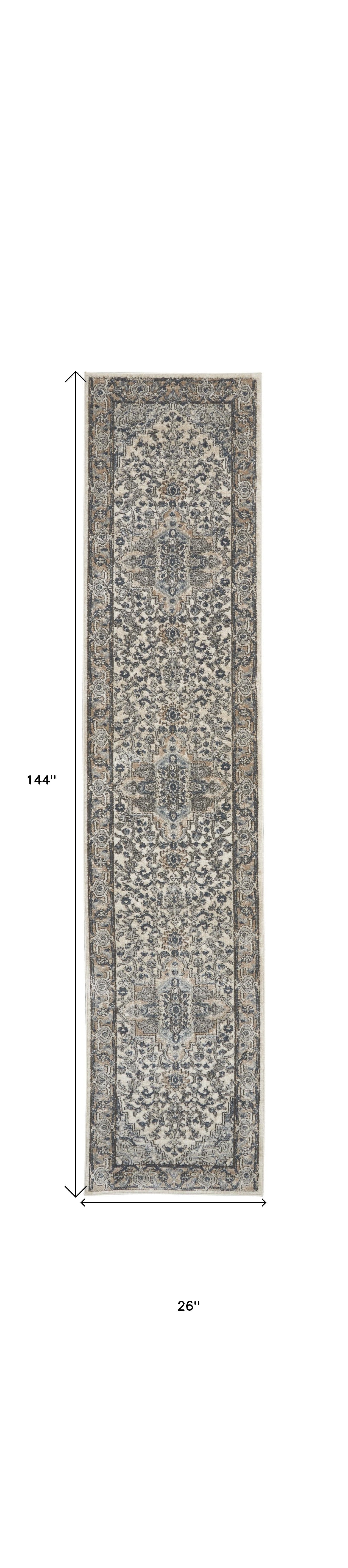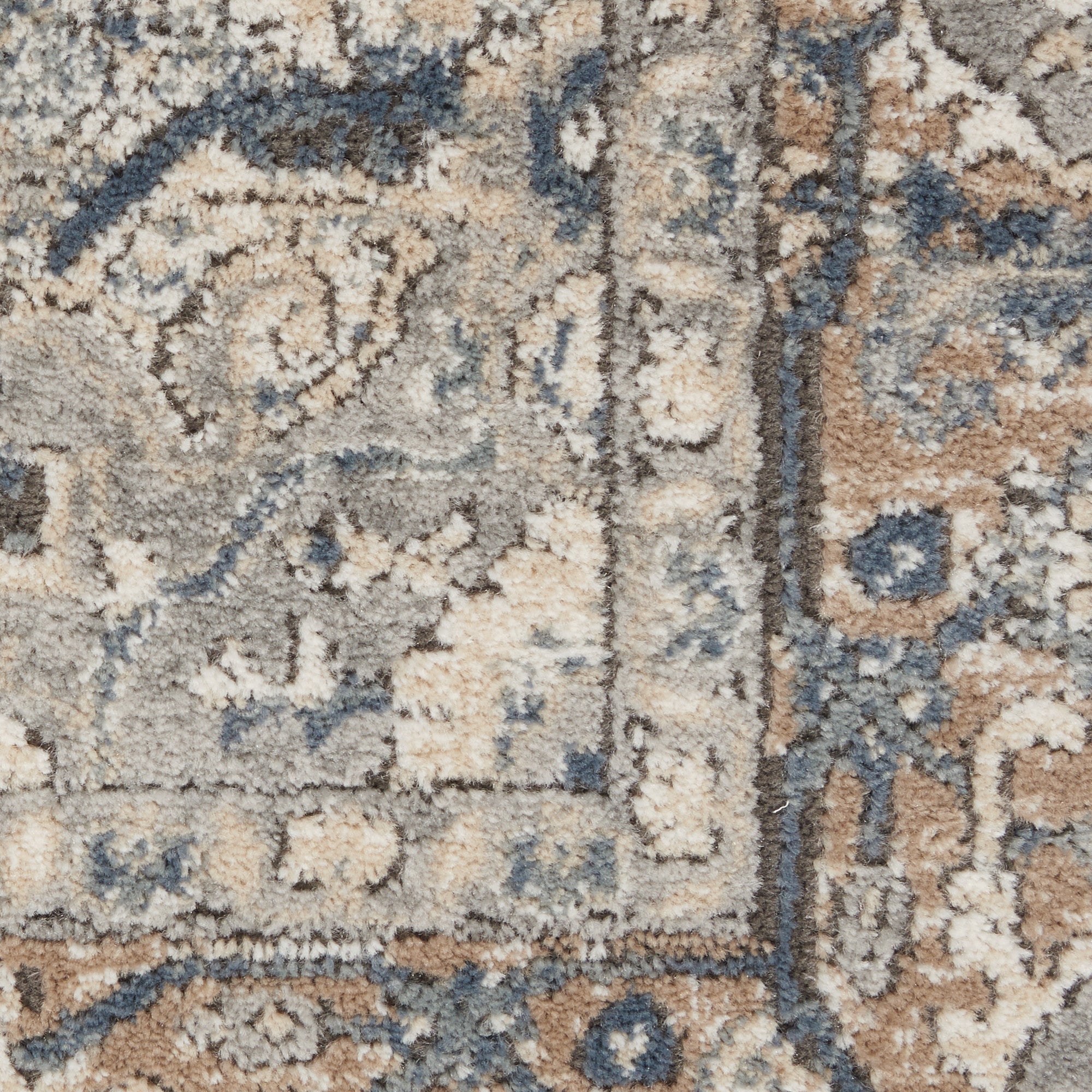 - Traditional power-loomed area rug with a beautiful gray and ivory medallion pattern.