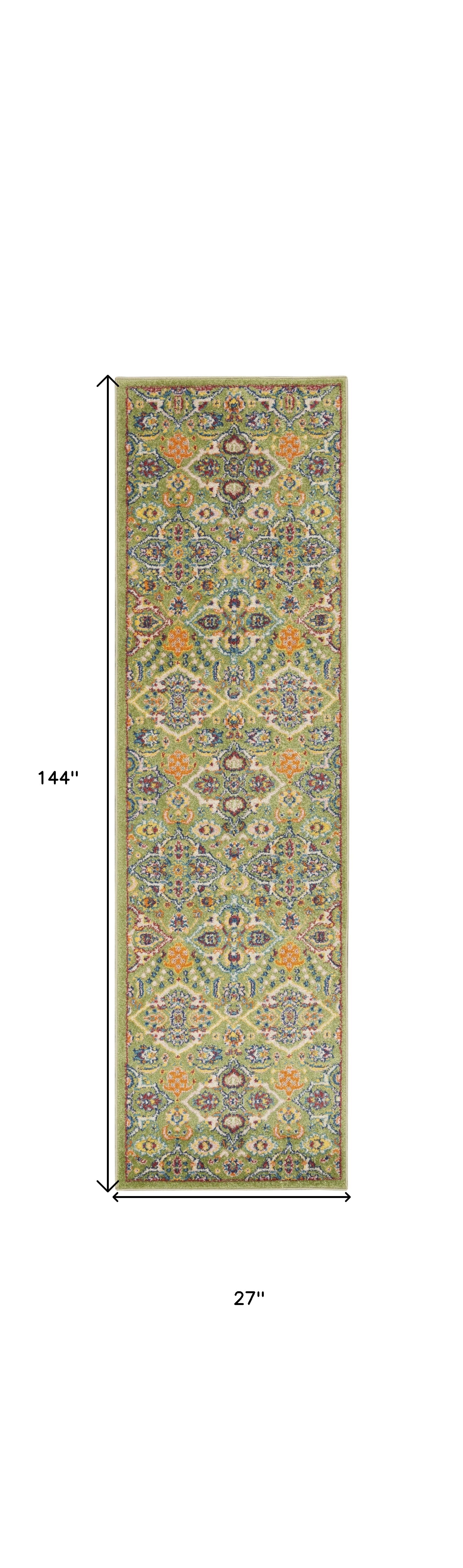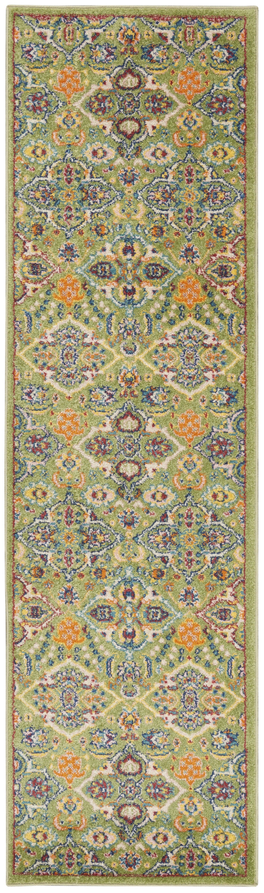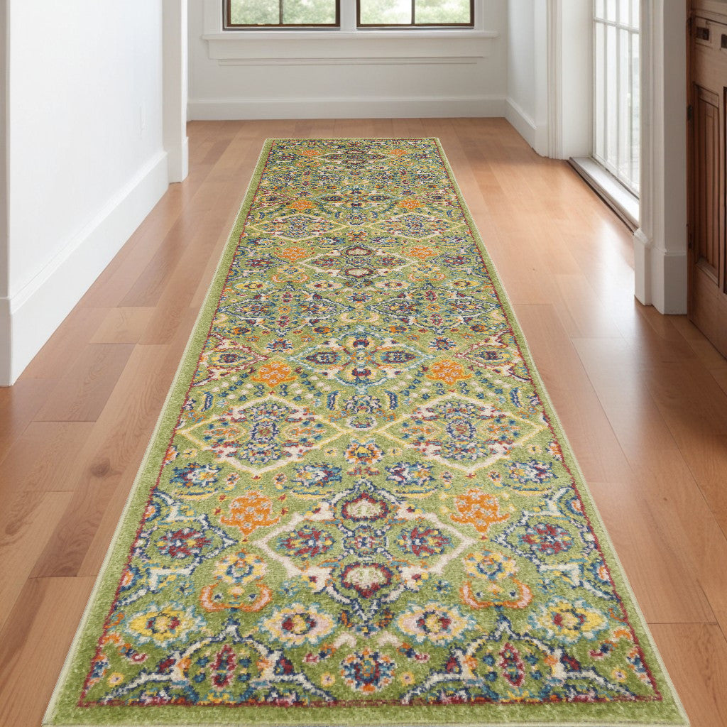 - Machine made area rug in transitional style with green and red polypropylene material.