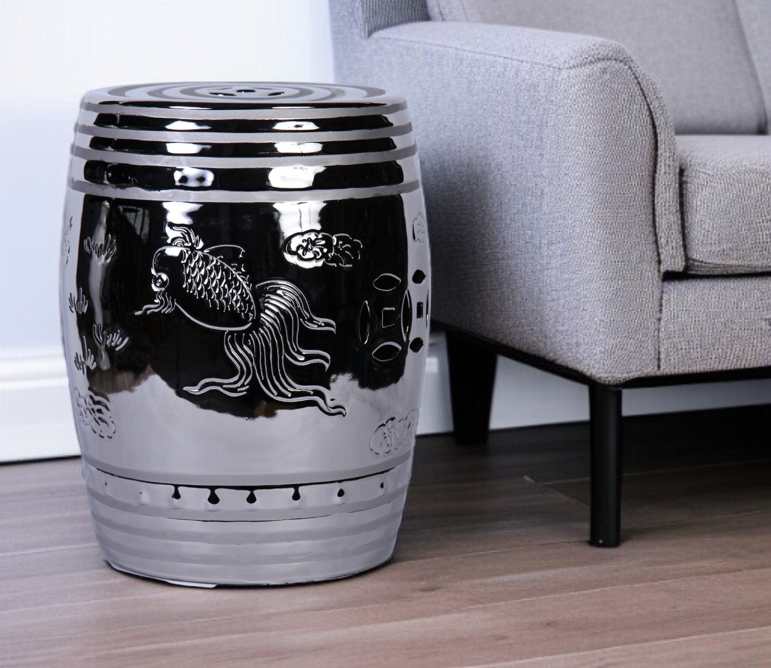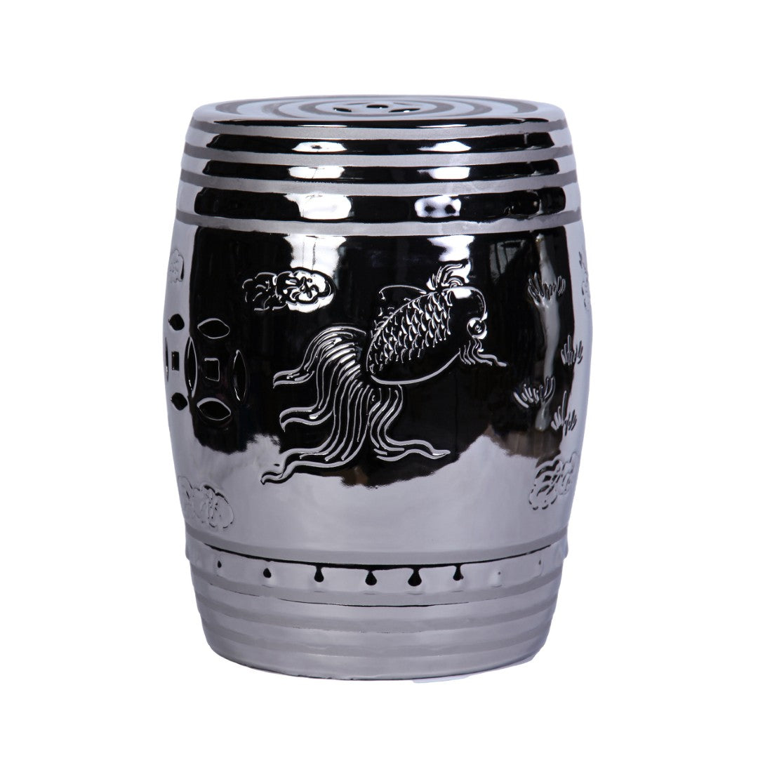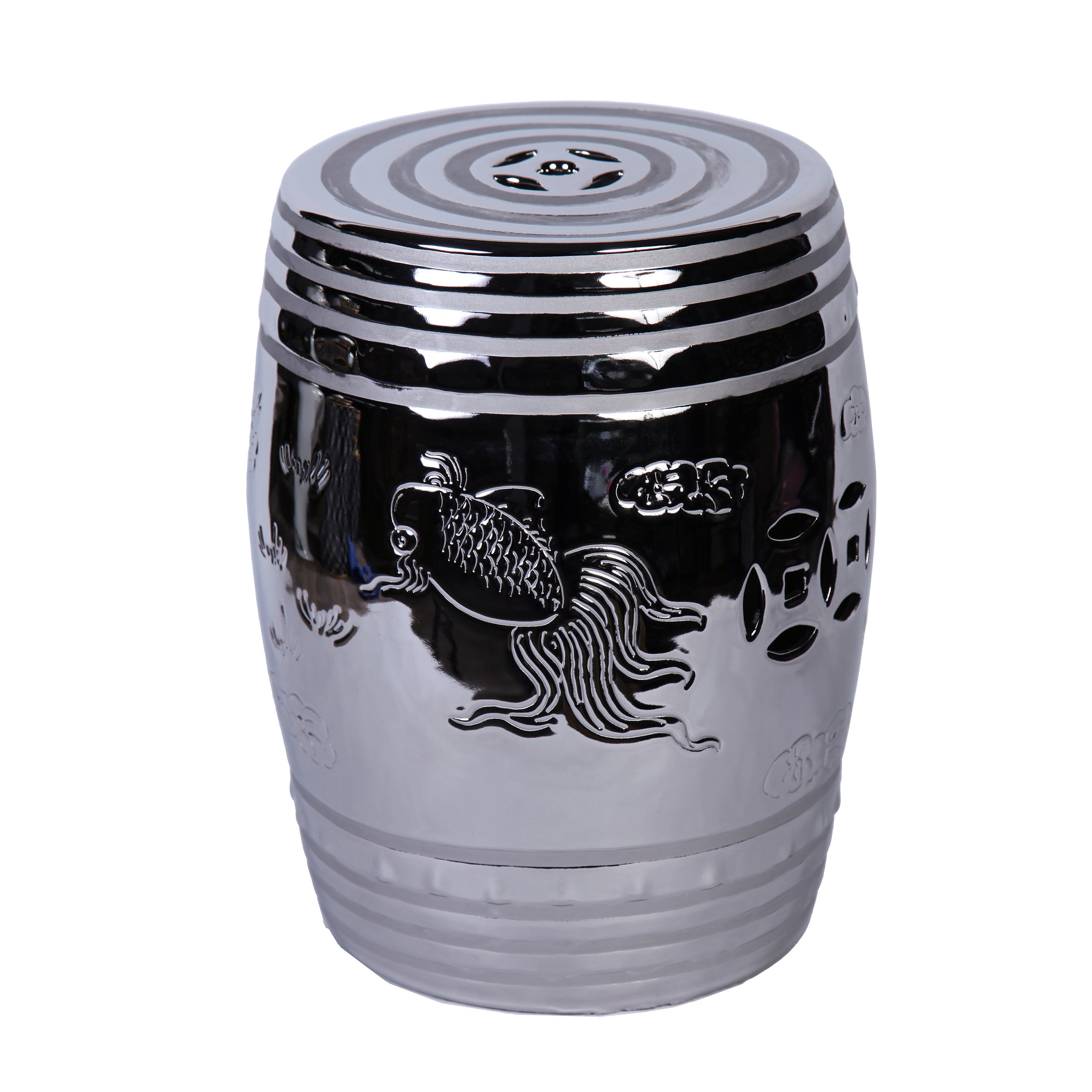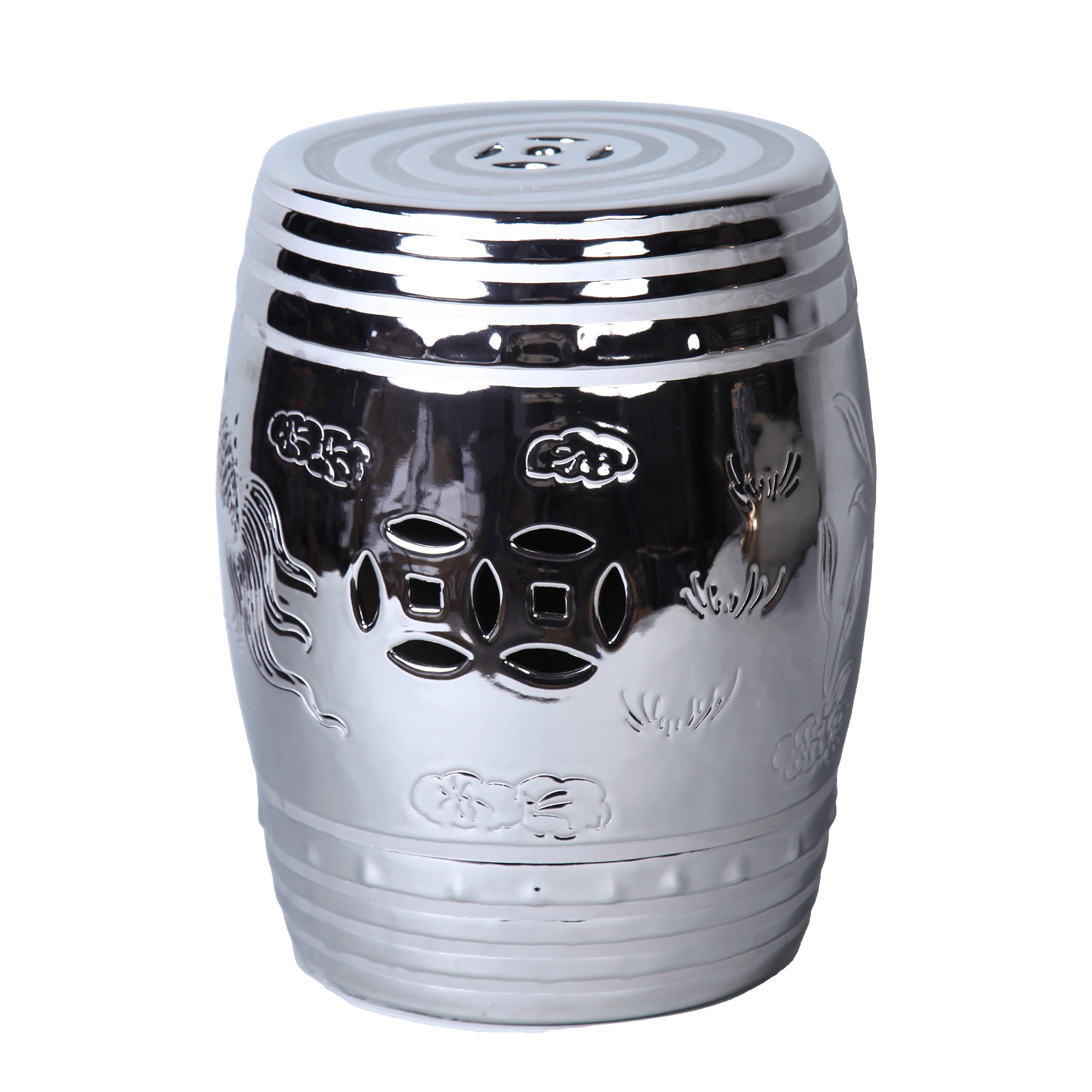 - Silver ceramic end-side table features an Asian design sensibility with carved detailing.