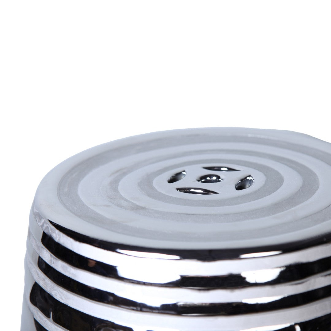 - Ceramic end table with a metallic silver / chrome plated finish.