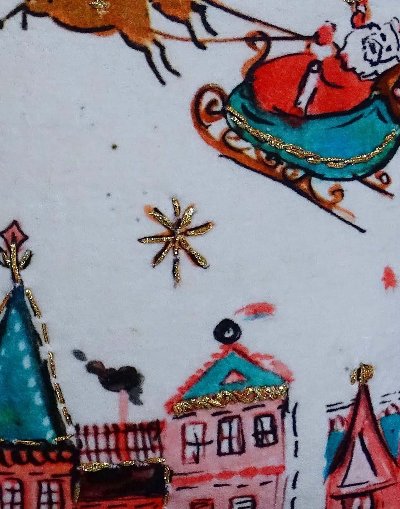 - Christmas-themed pillow cover and insert in red and green fabric.