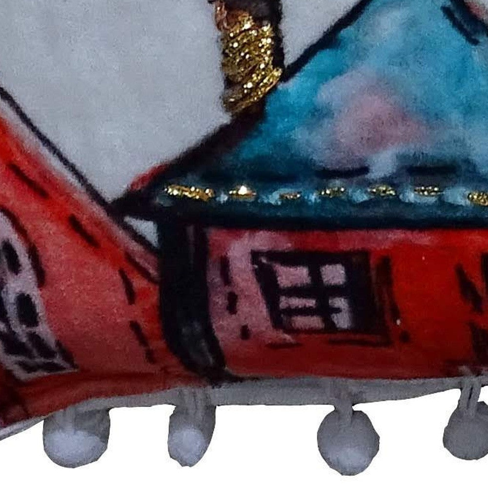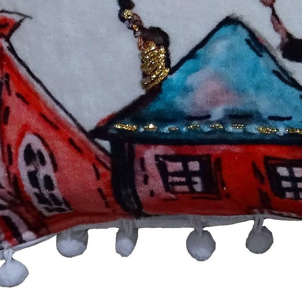 - Handmade accent throw pillow with festive pom poms.
