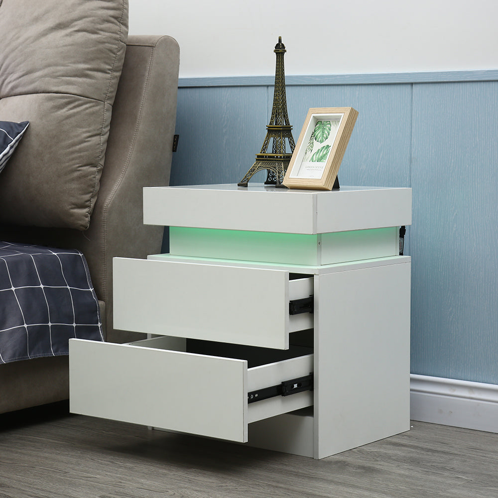 - Modern and contemporary sleek nightstand with lighting. Includes LED lighting and USB power supply.
