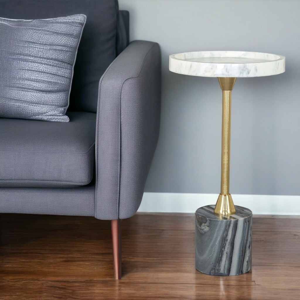 - Elegant iron end-side table with a chic and sophisticated blend of gold metal with dark gray and white marble.