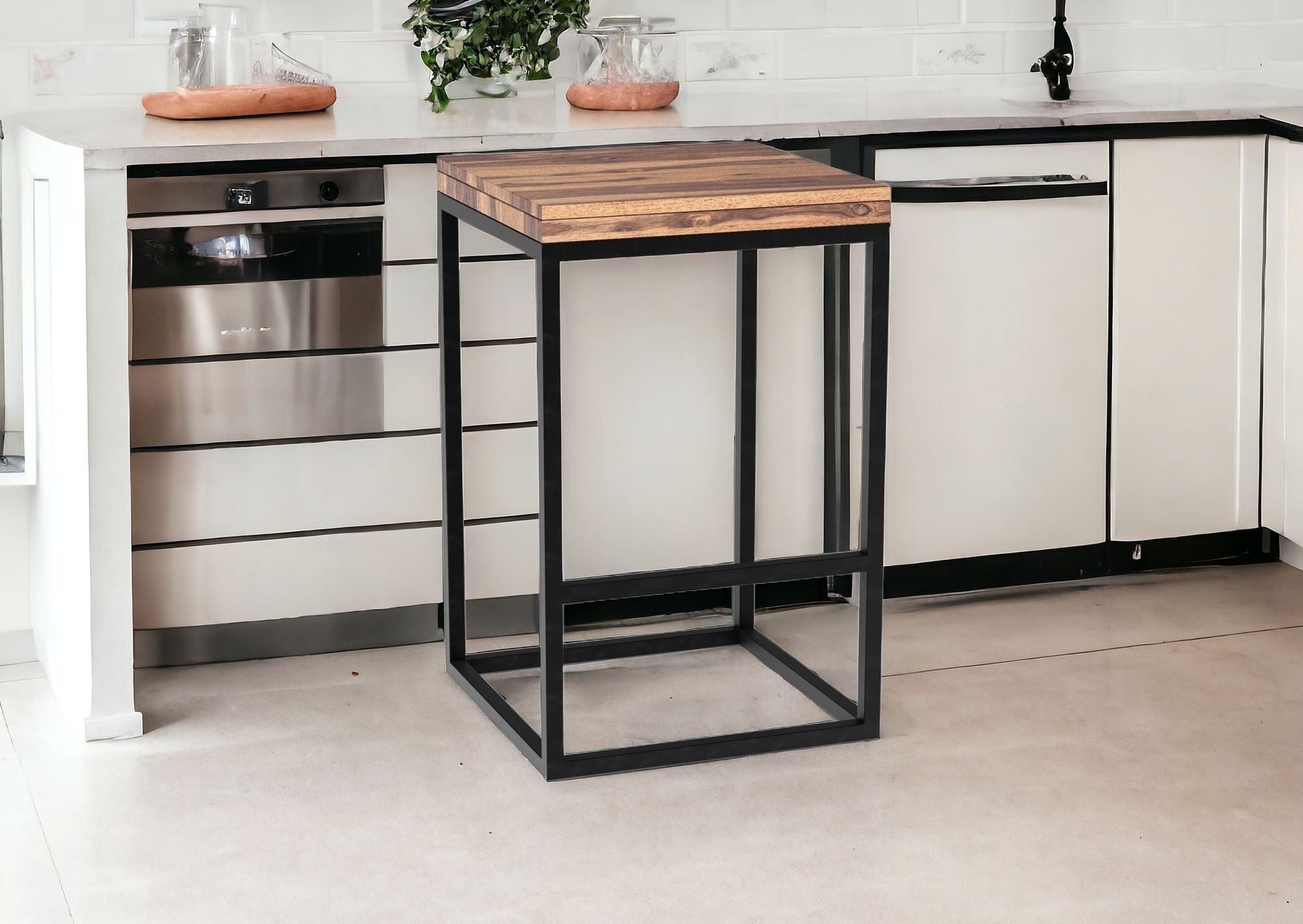 - Solid and manufactured wood seat with a brown finish and a sturdy iron frame in black.