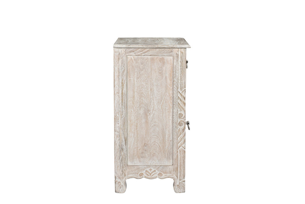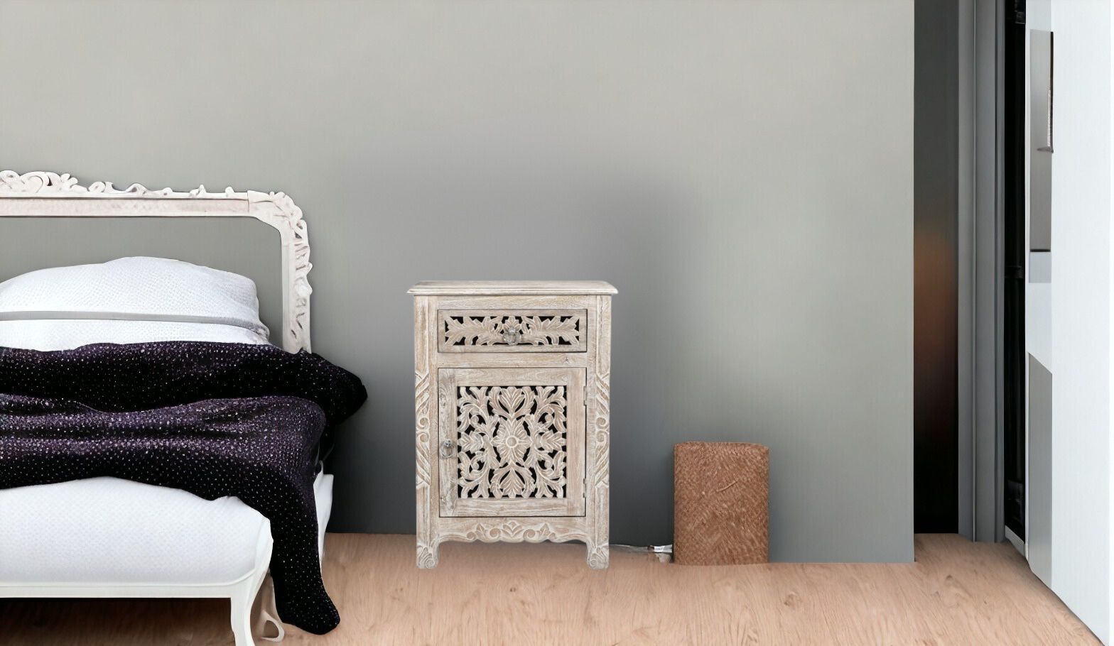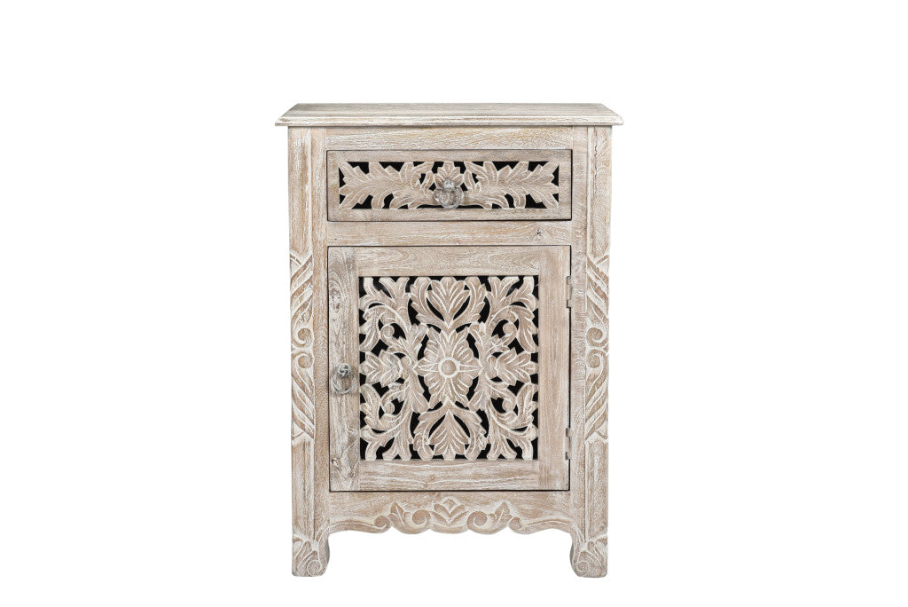 - Gorgeous floral scroll and carved detailing gives this hand crafted nightstand lots of visual appeal and dimension.