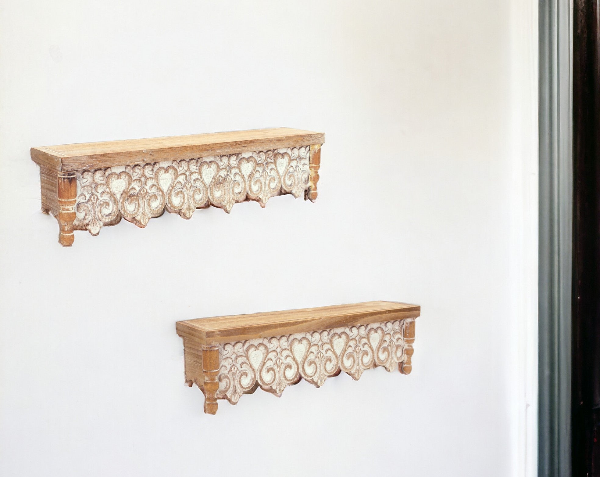 - Features a rustic whitewash finish that accentuates the scrolling wood work detailing.