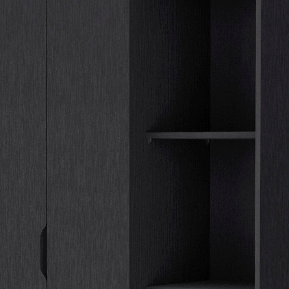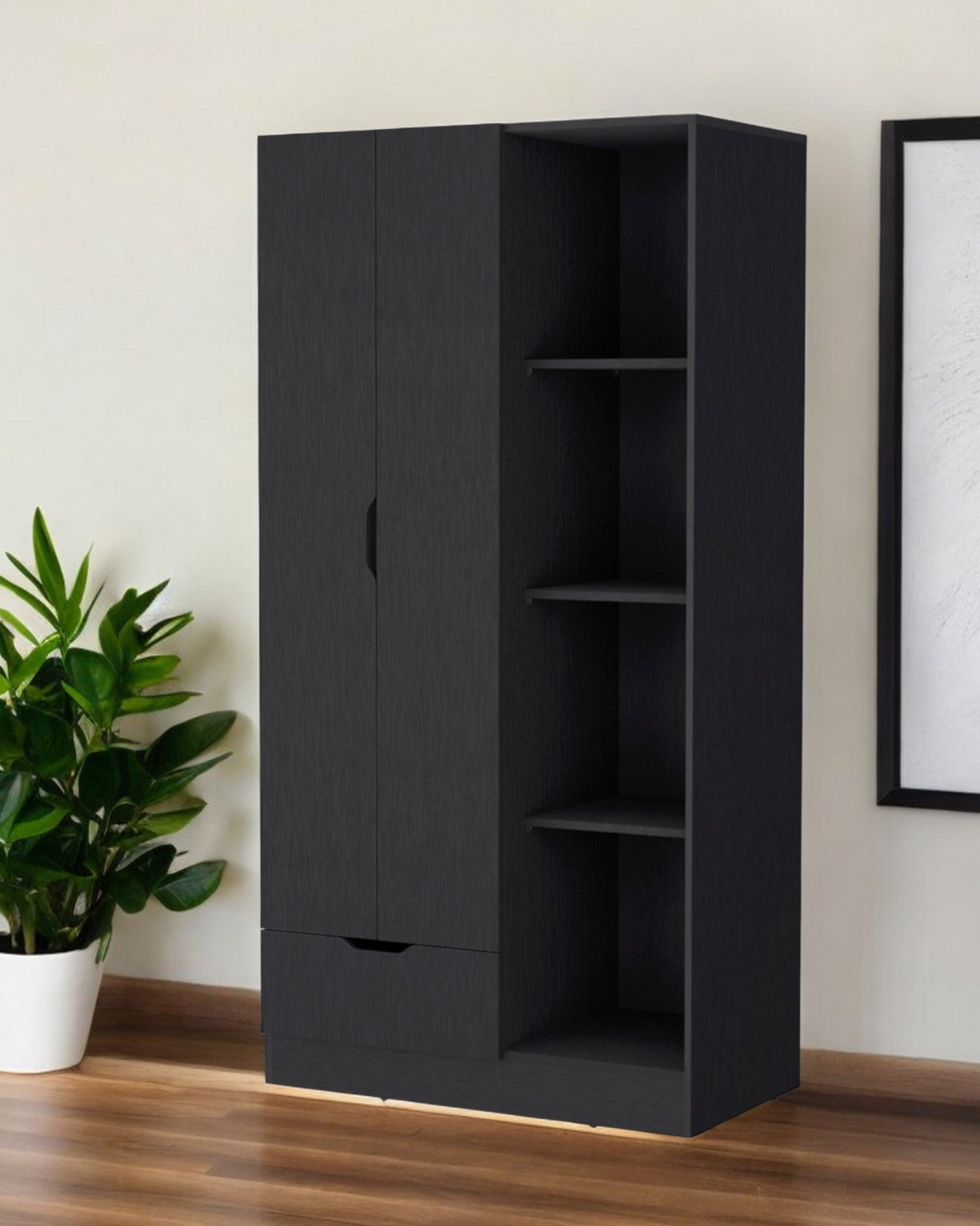 - This dresser include both dresser drawers and wardrobe doors that open to reveal shelves or a space to hang clothes.