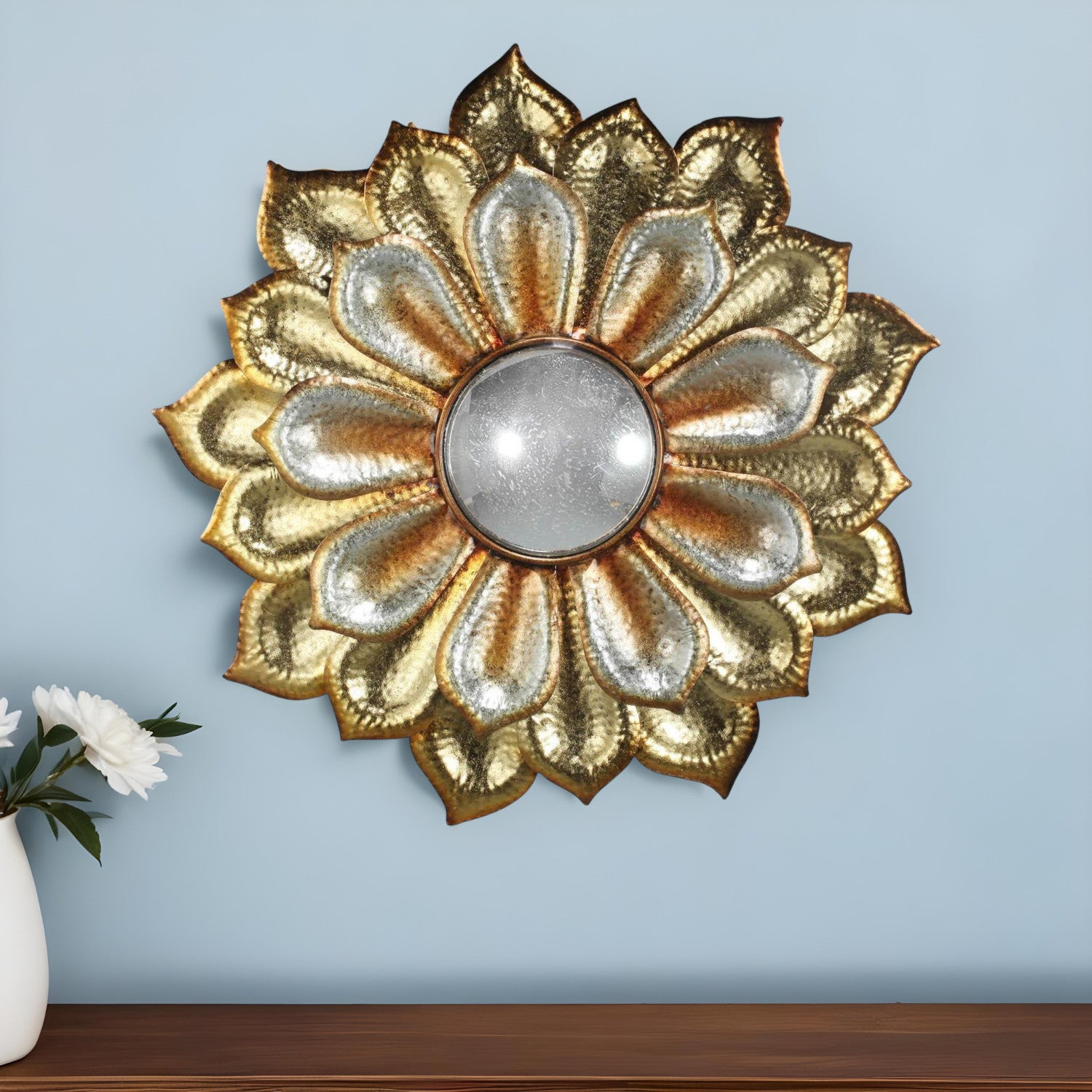 - Wall-mounted gold mirror with a stylish mid-century design influence.