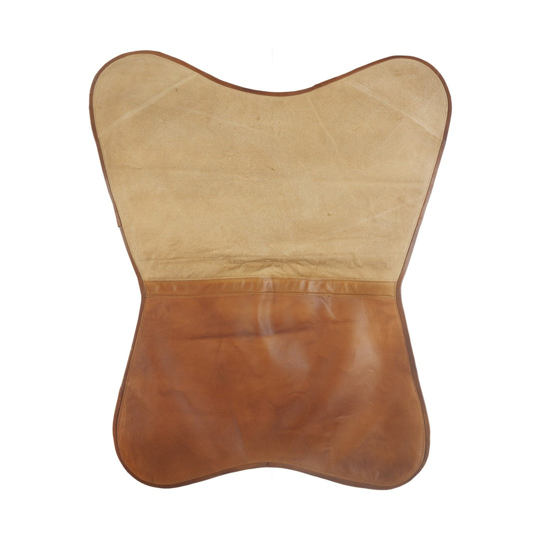 - Rustic butterfly chair in brown and tan upholstery, with a stylish loose back design.
