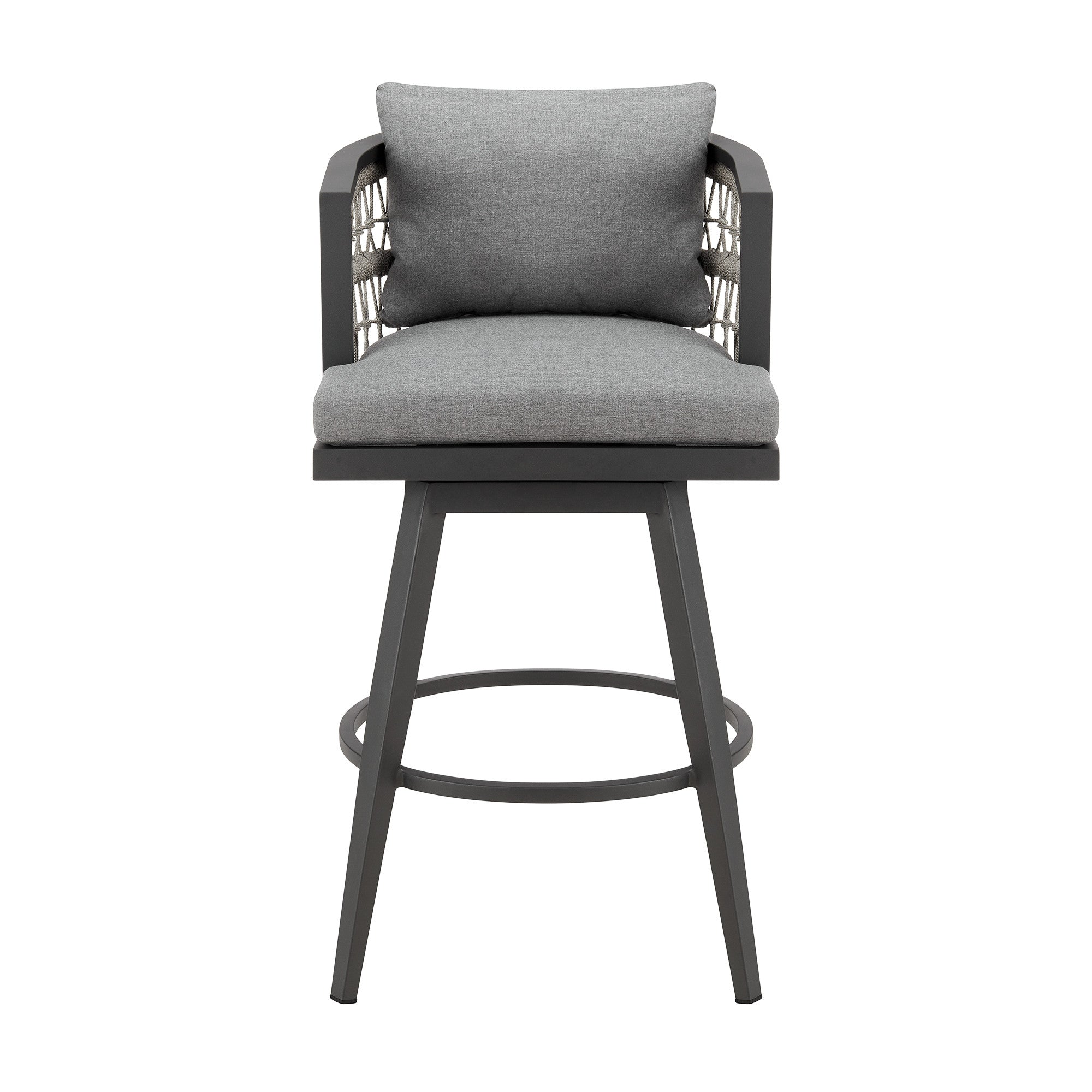 - Stylish and durable outdoor bar chair with a round seat in gray color.