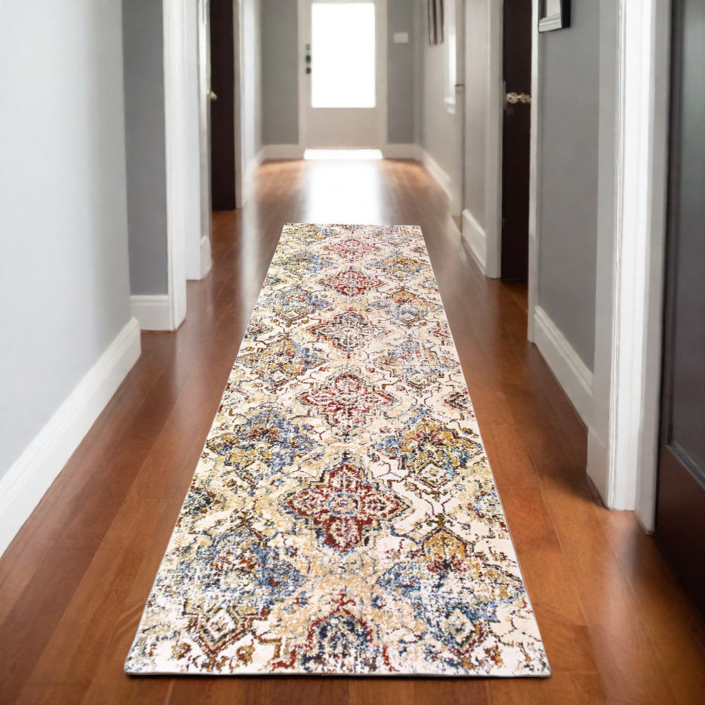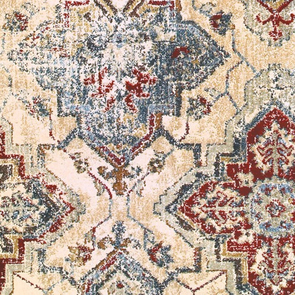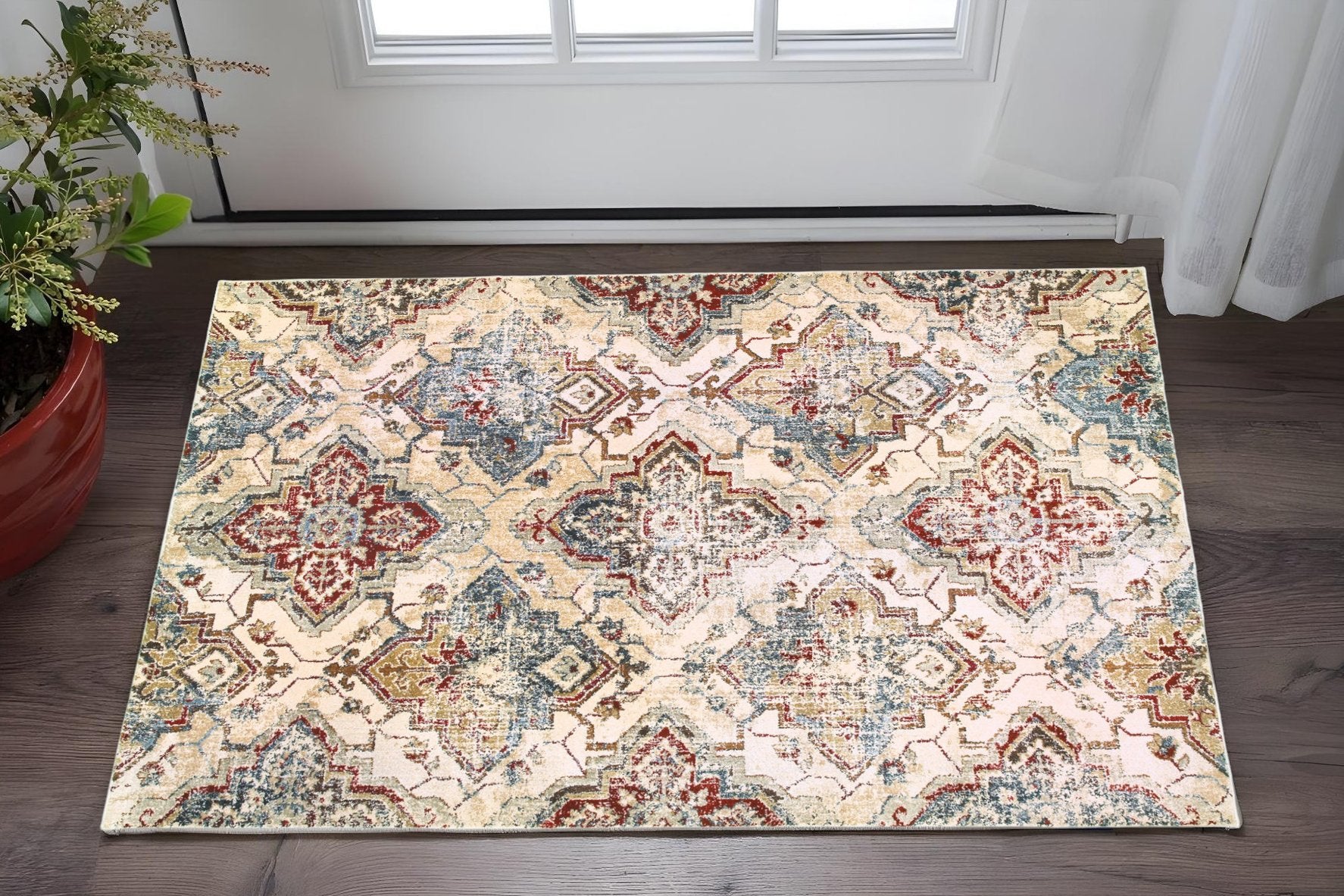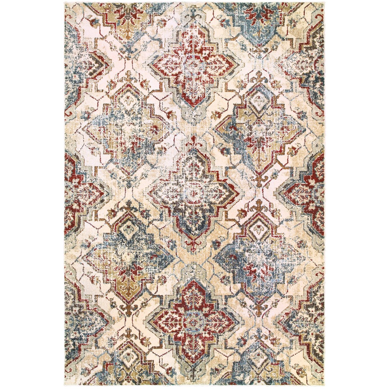- Ivory and gold area rug perfect for traditional bedroom decor, with machine-made construction for easy care.