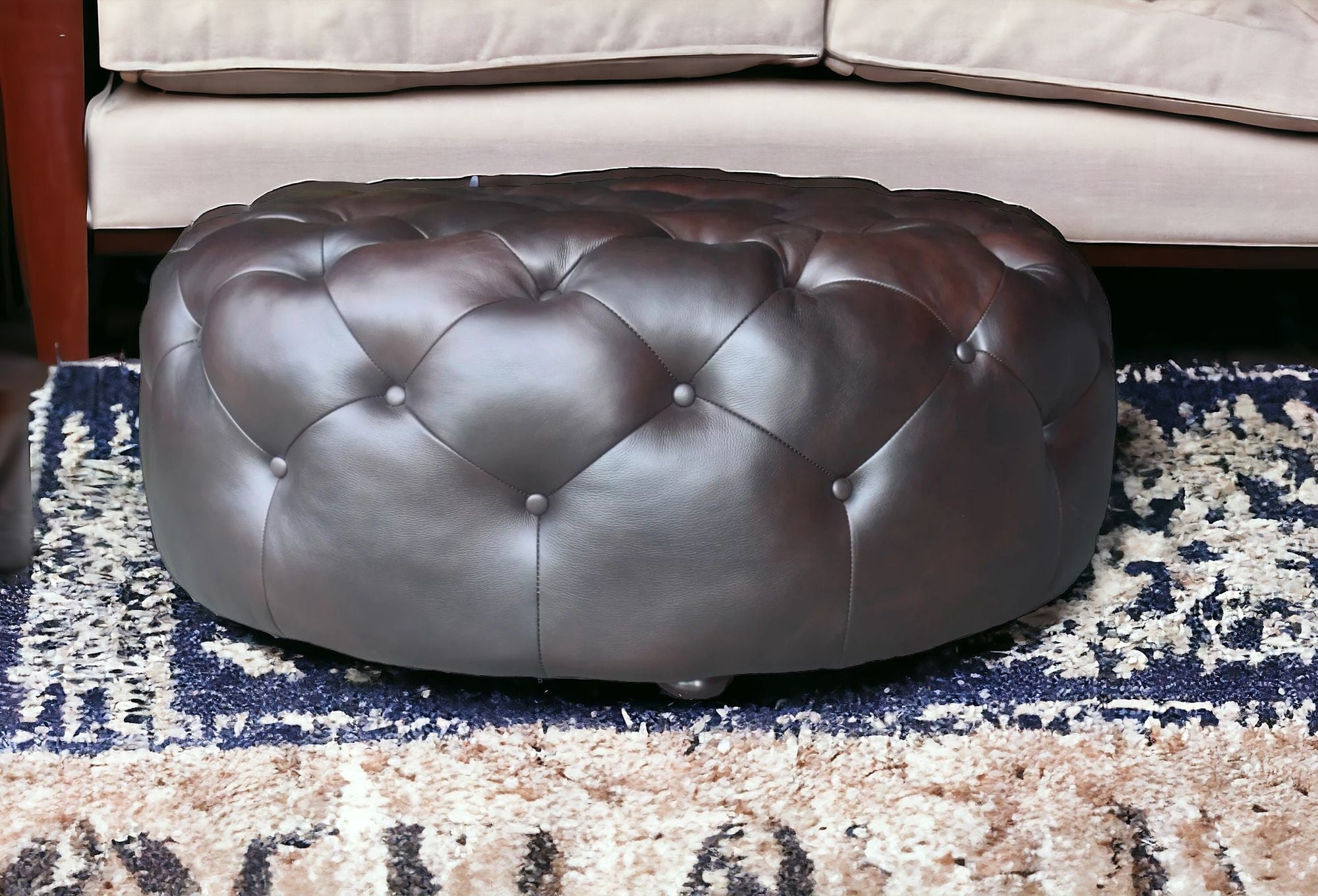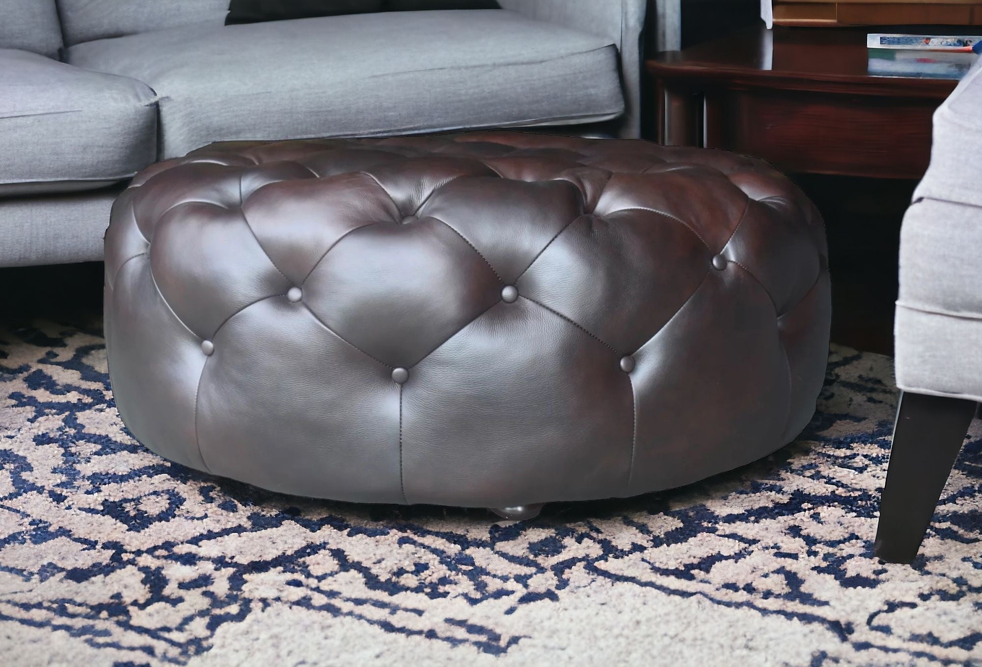 - Fashionable Round Tufted Genuine Leather Ottoman.