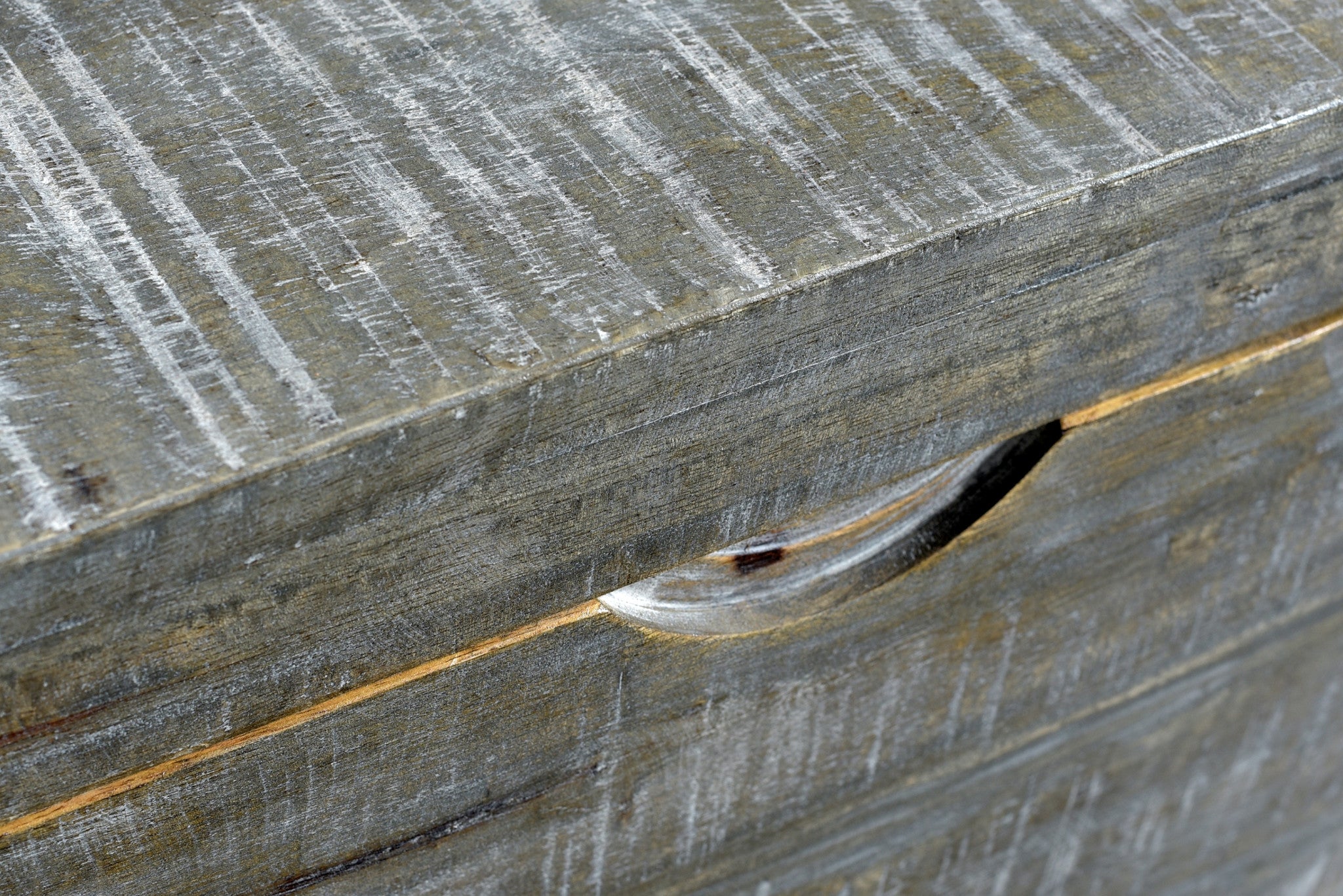 - Flip top storage bench with rustic wood scoring and black metal legs.