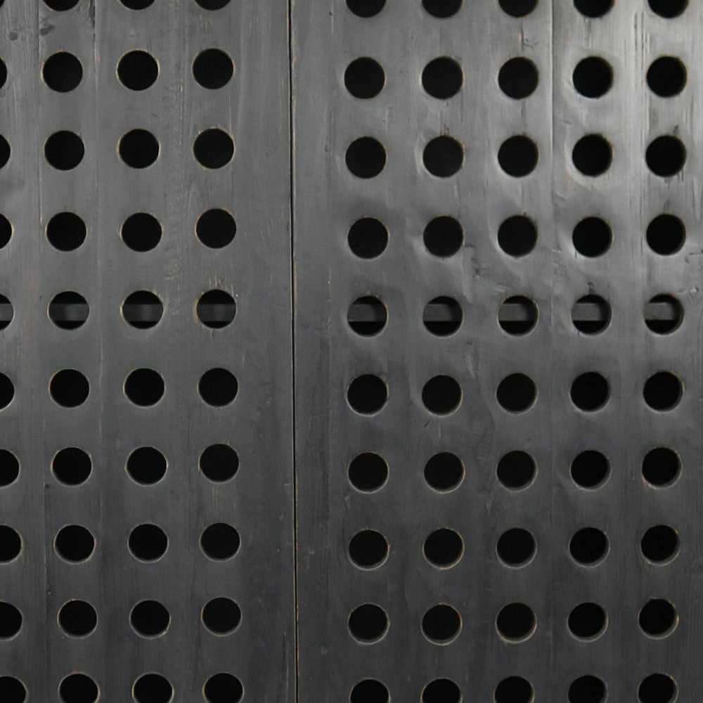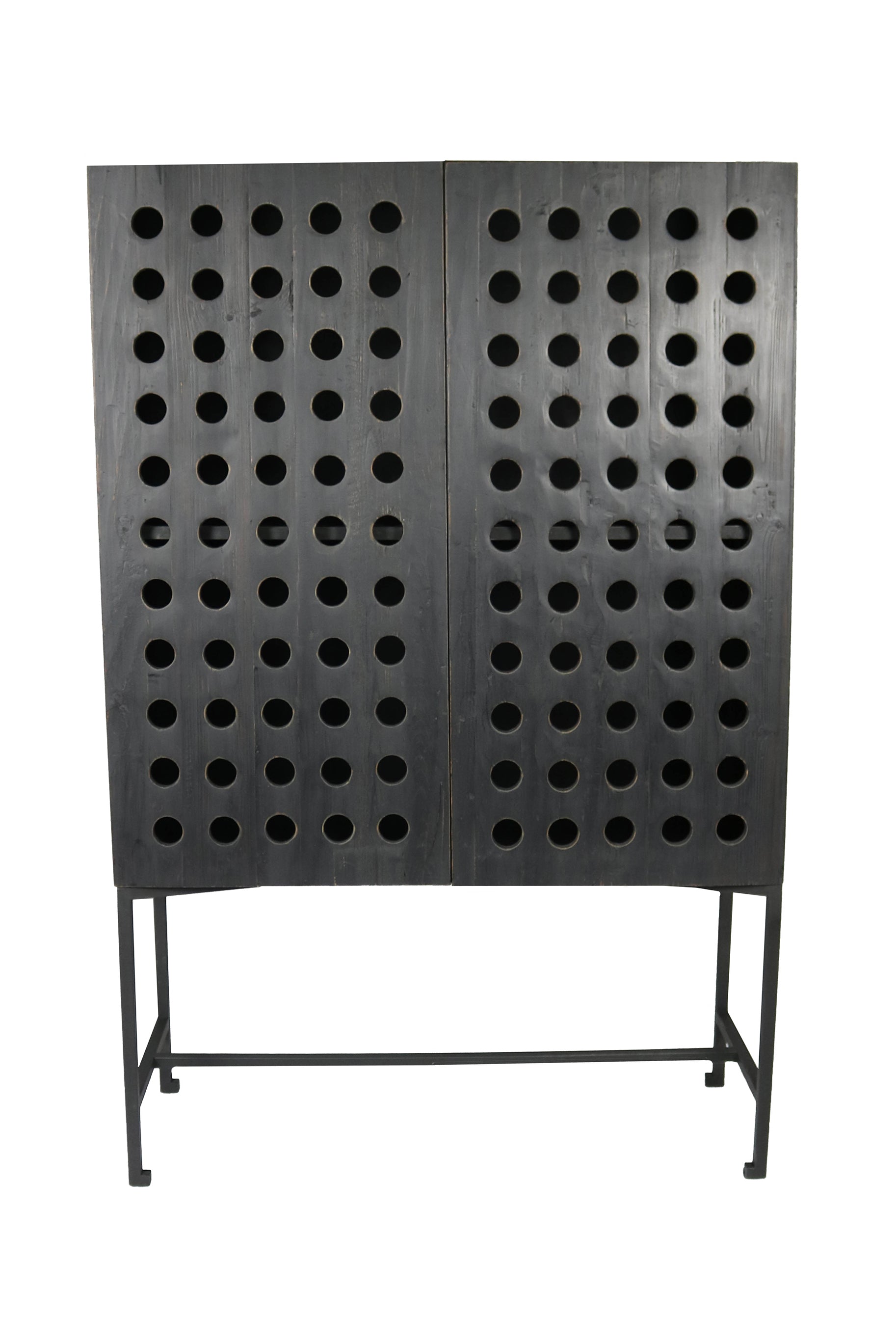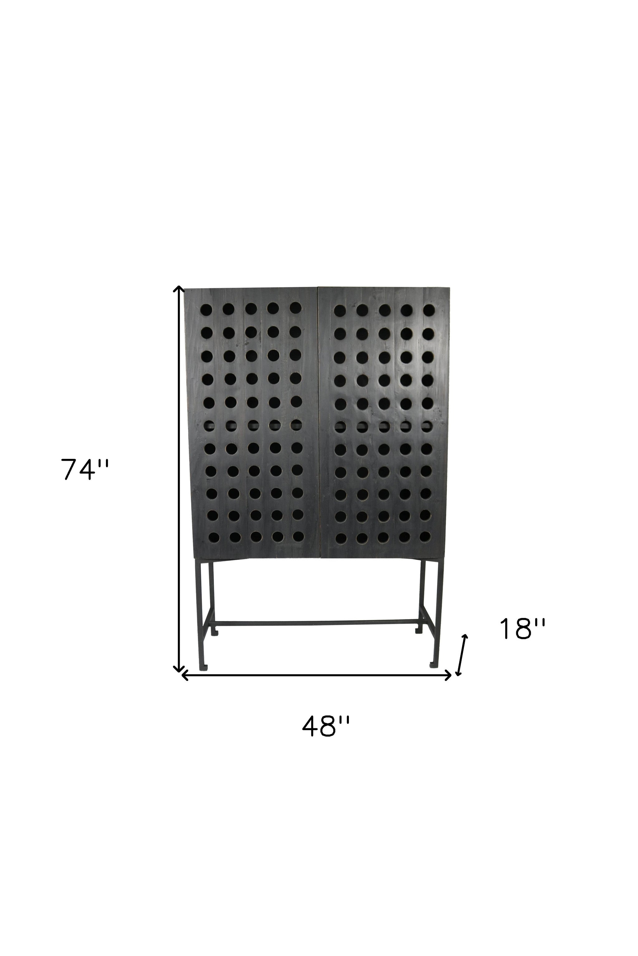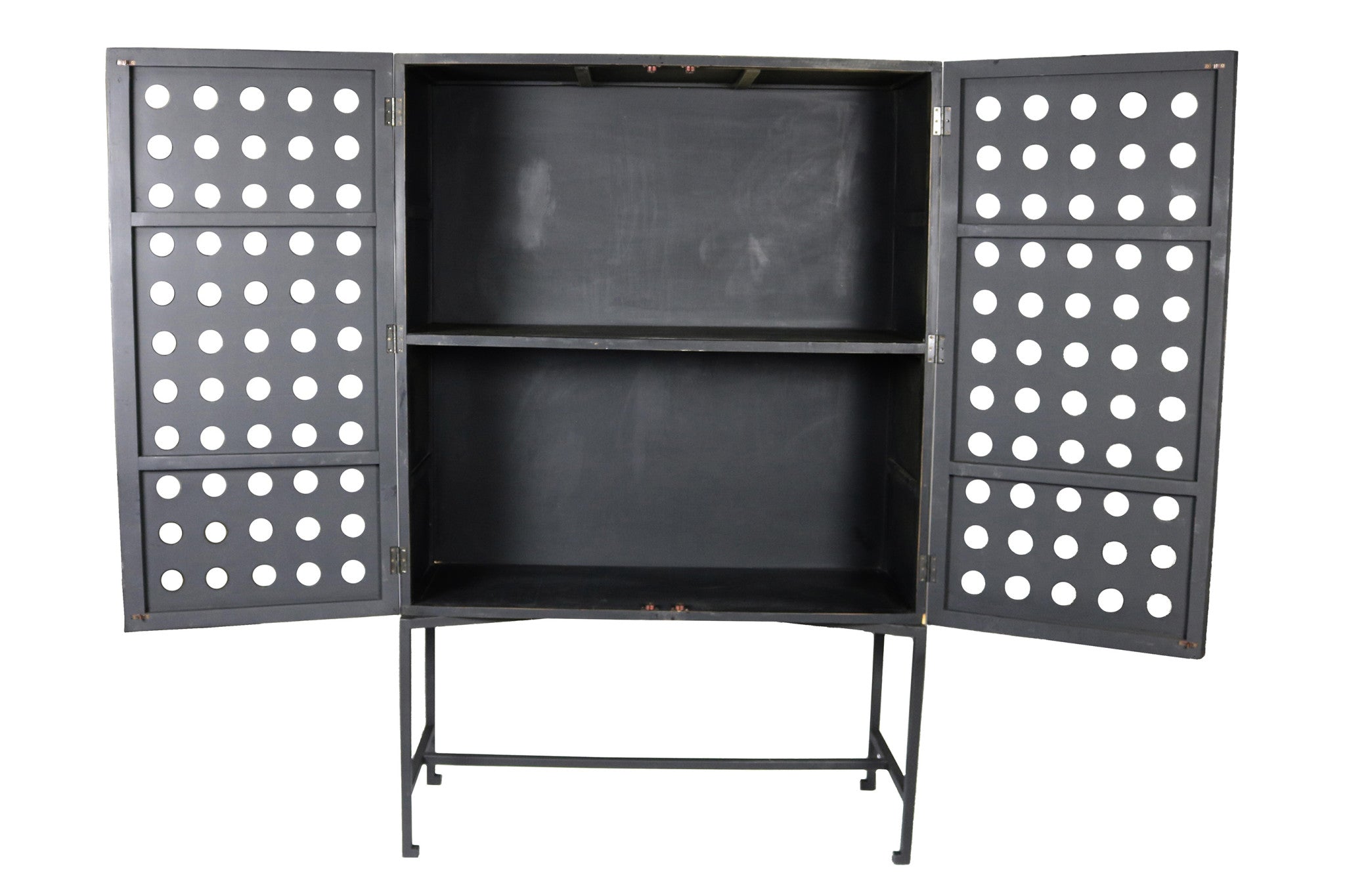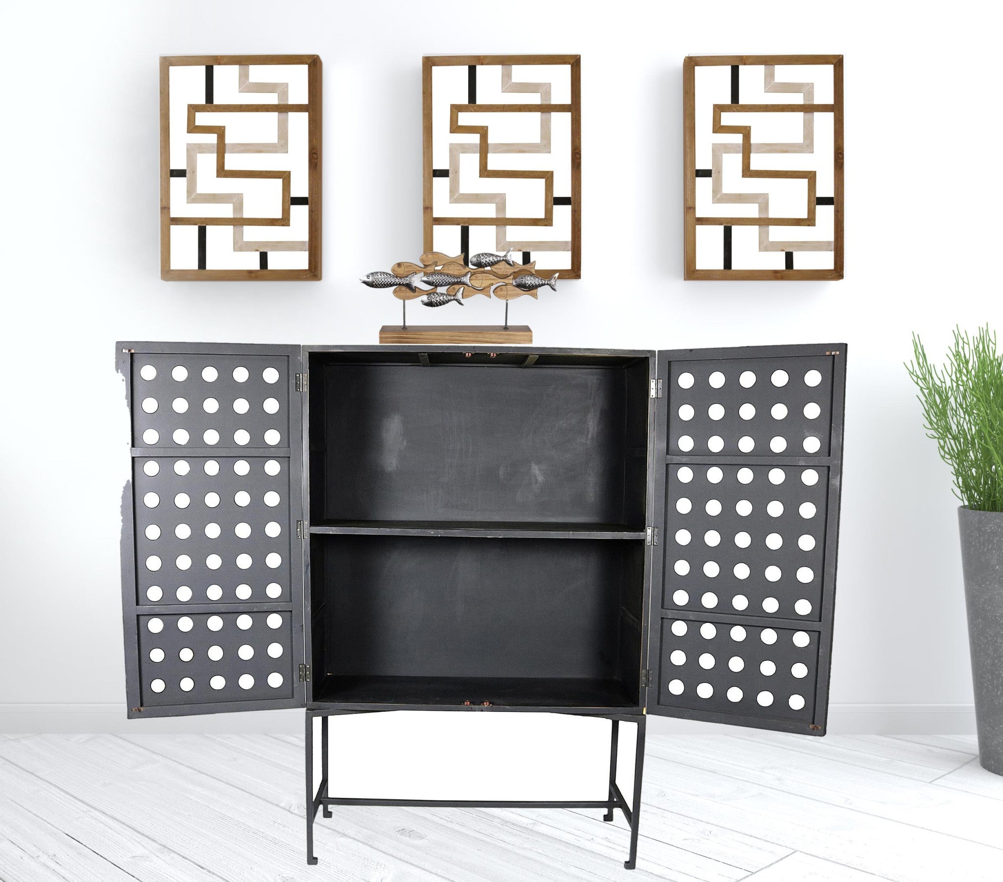 - Charcoal Two Door Accent Cabinet with Pierced Holes on a cast iron base for a storage solution with a unique look.