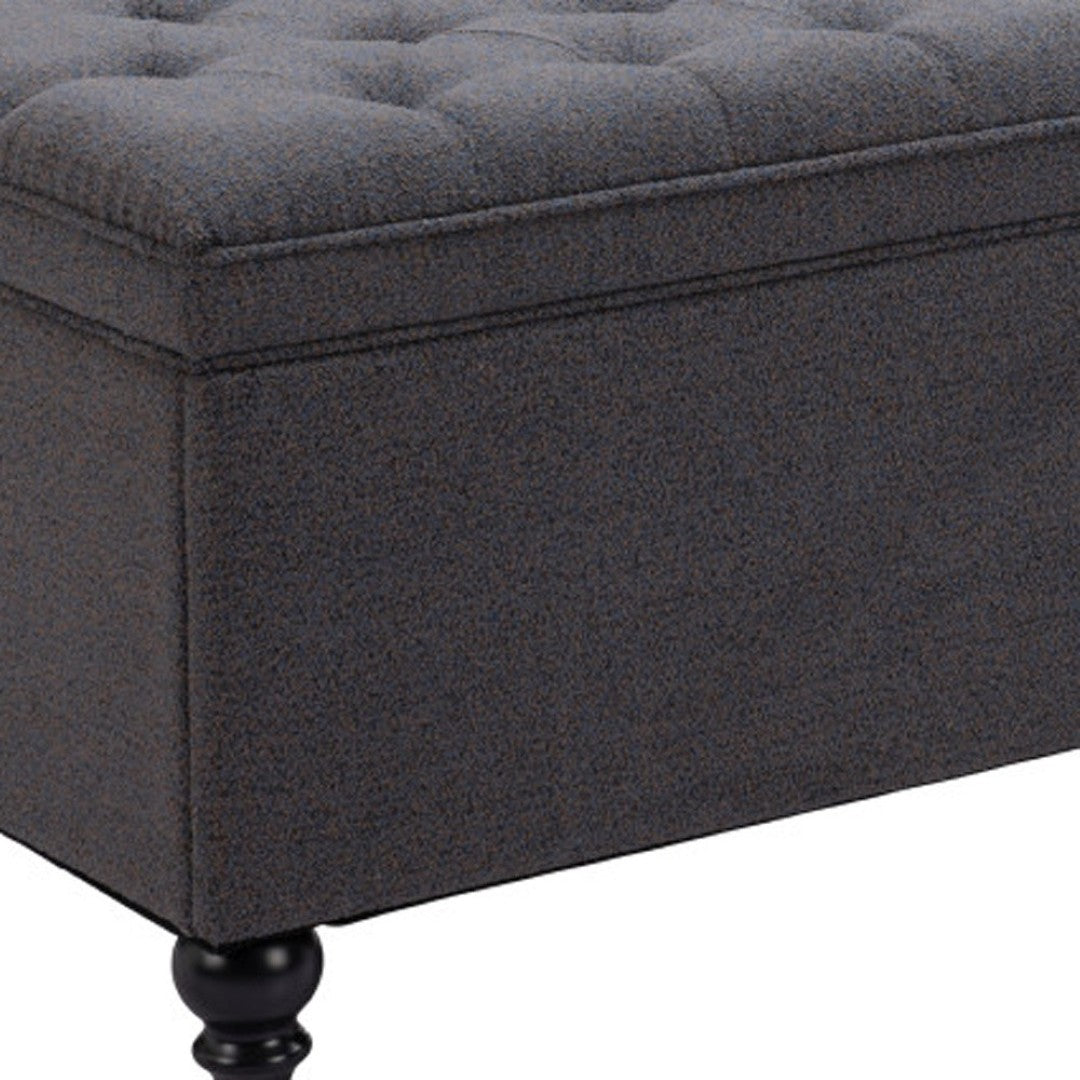 - Classic and timeless button tufted storage bench with carved black solid wood feet.