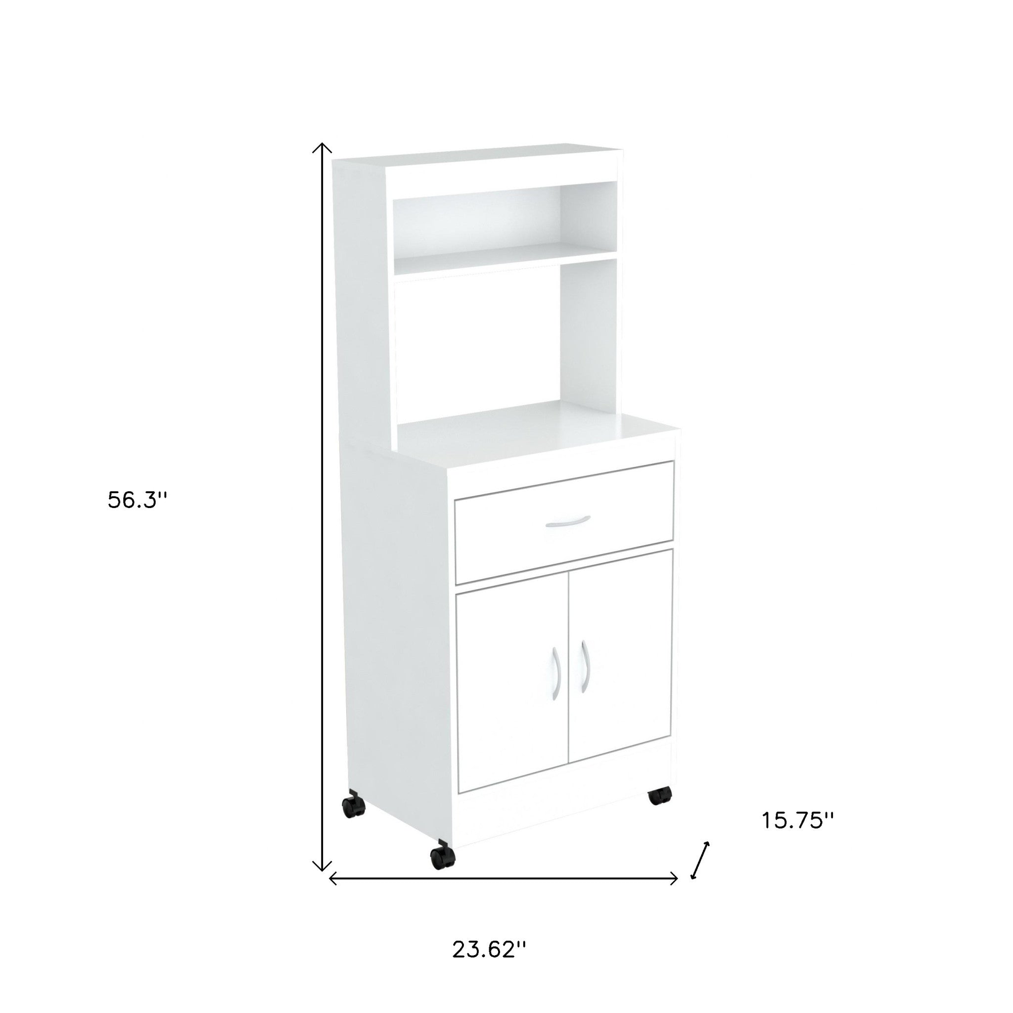 - White laminated engineered wood rolling microwave cabinet.