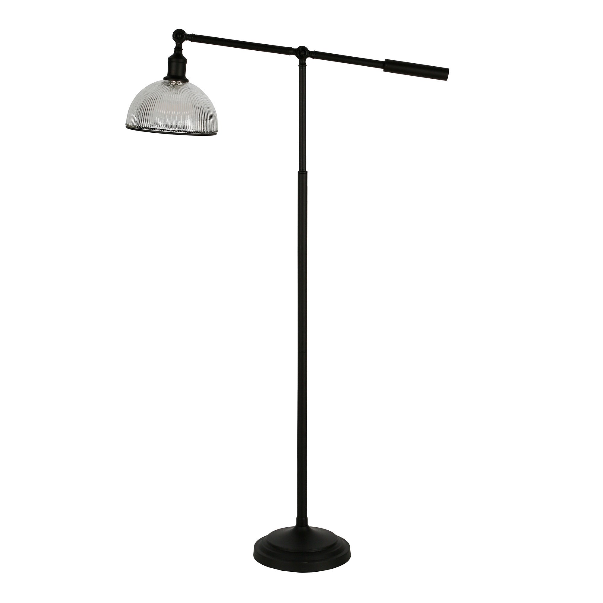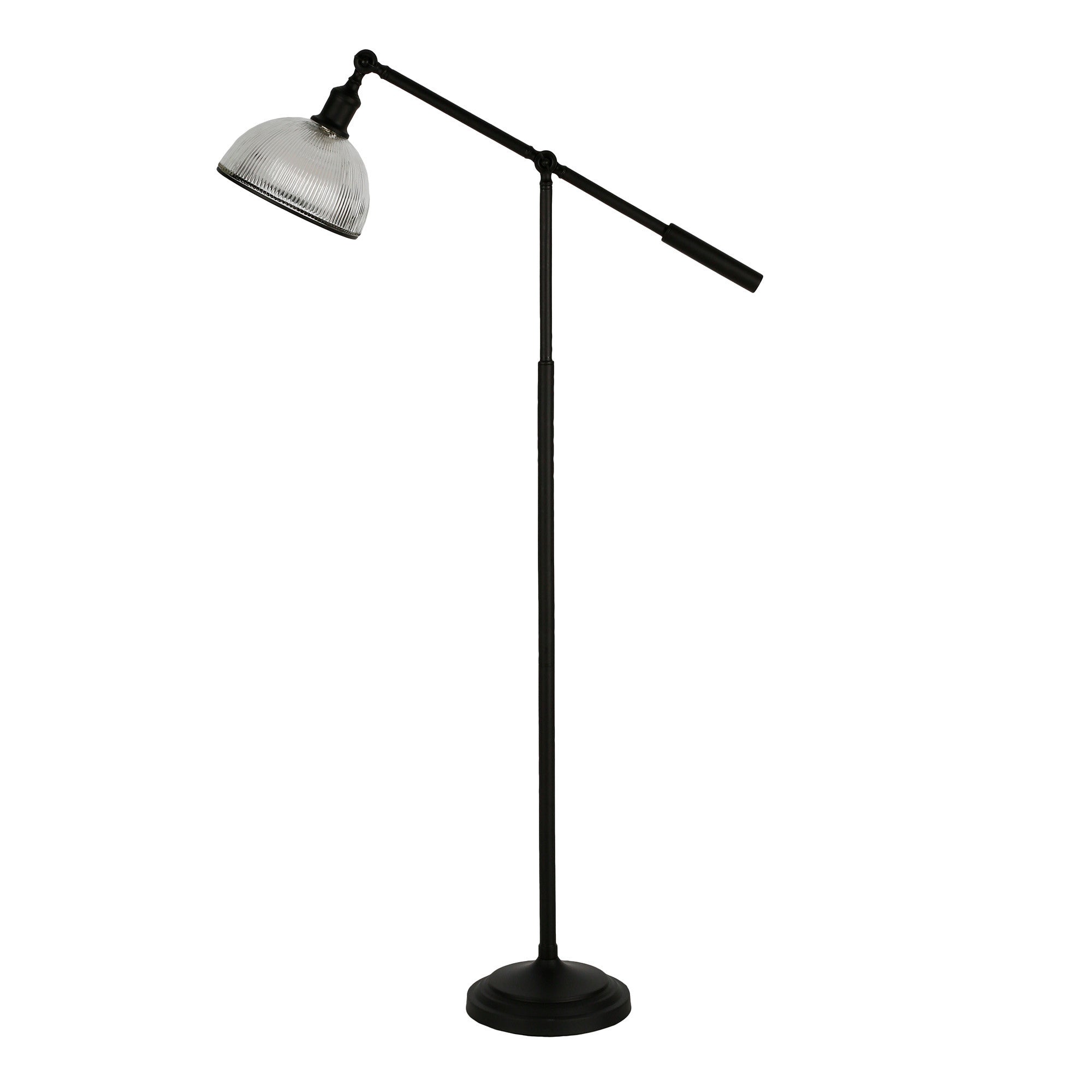 - Handcrafted blackened bronze finish is applied to the round adjustable metal and glass base.
