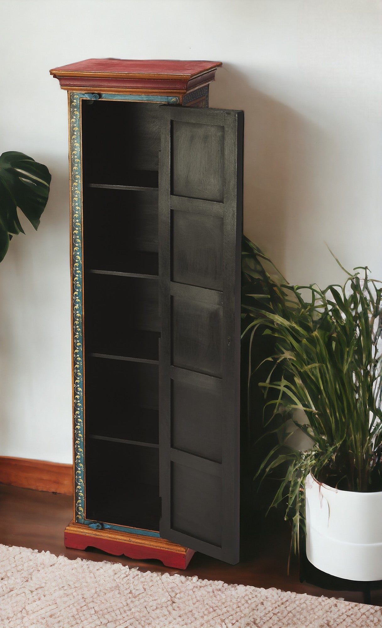- Hand Painted Narrow and Tall Accent Cabinet. Highly detailed painting includes shades of Red, Blue, Gold, and Orange.