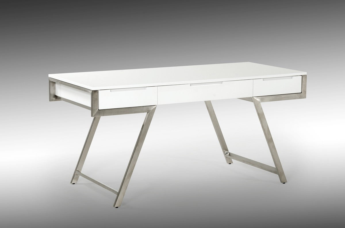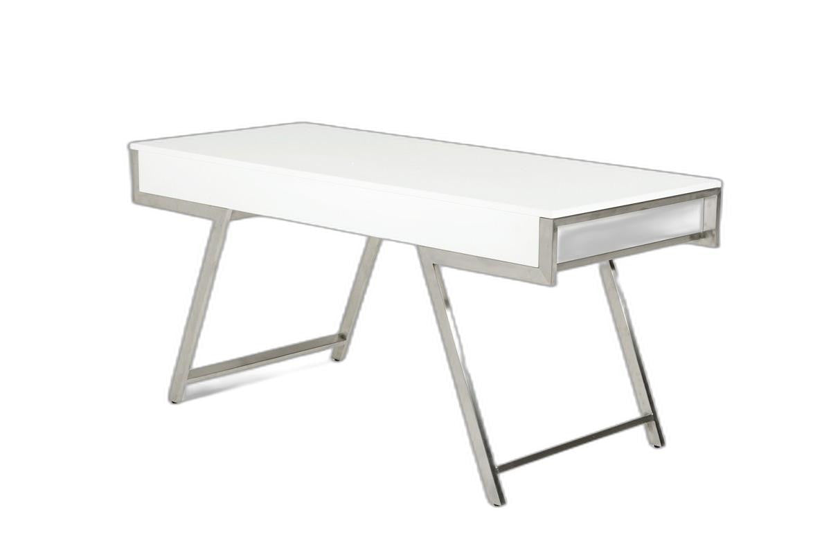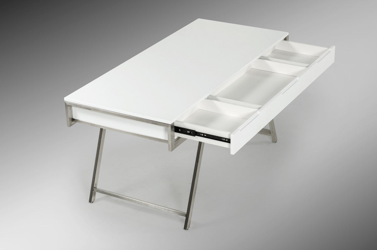 - Features a modern White High Gloss Finish that creates a chic contrast to the stainless steel legs.