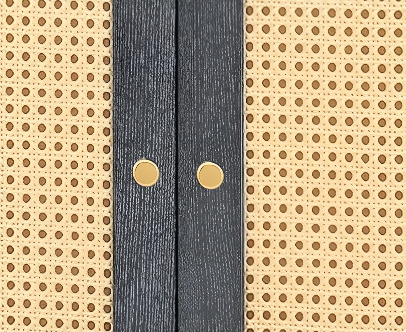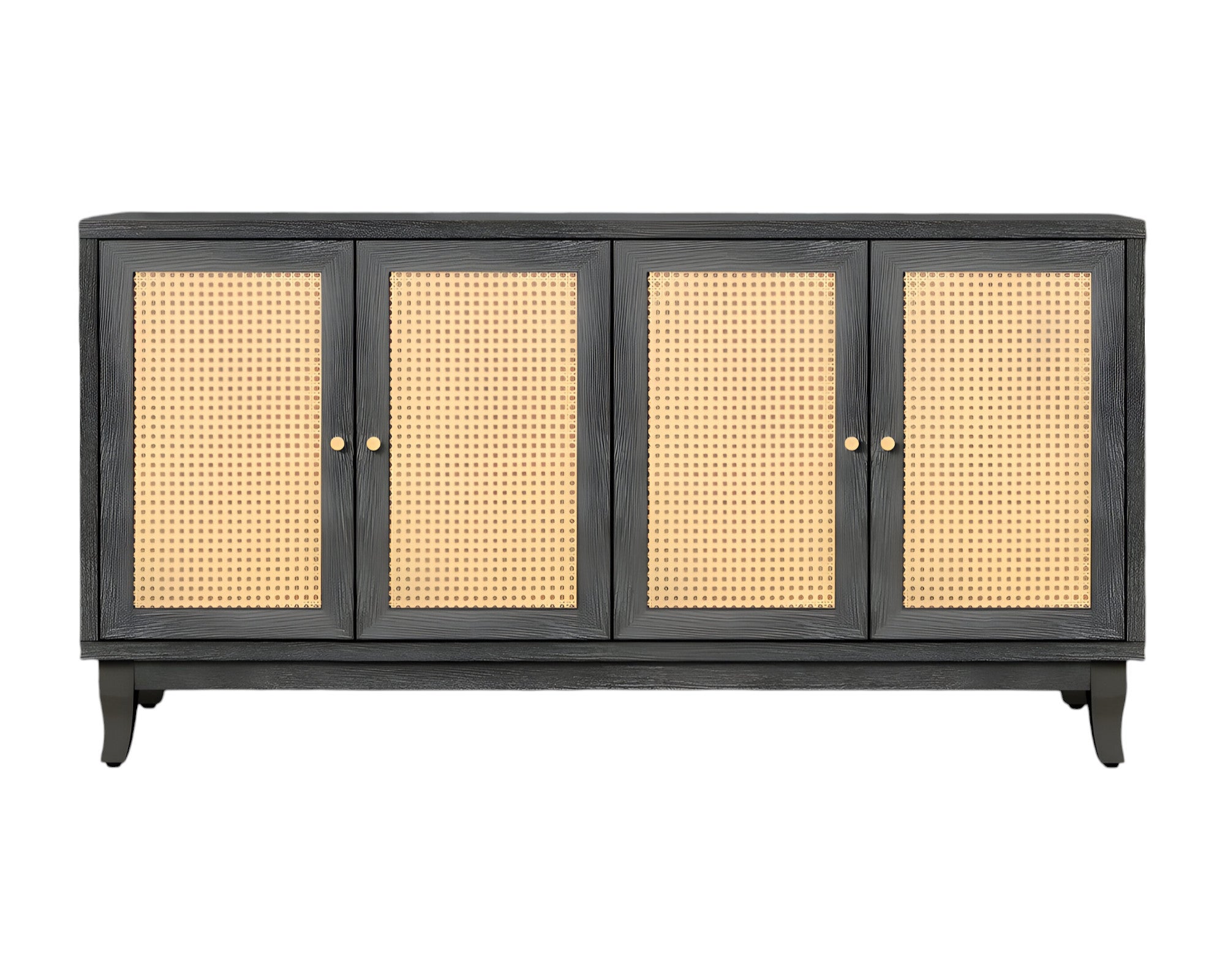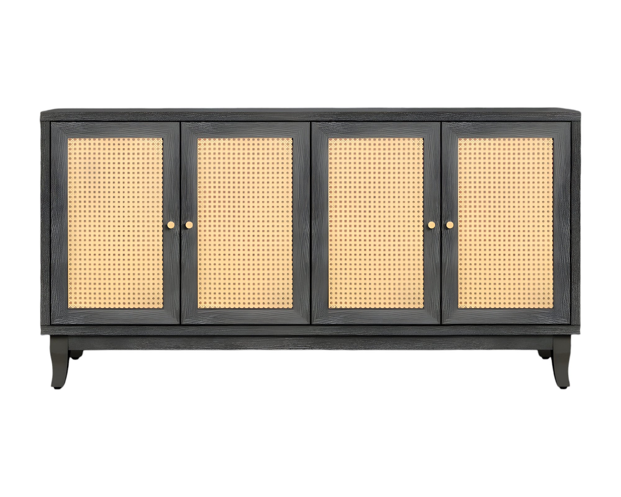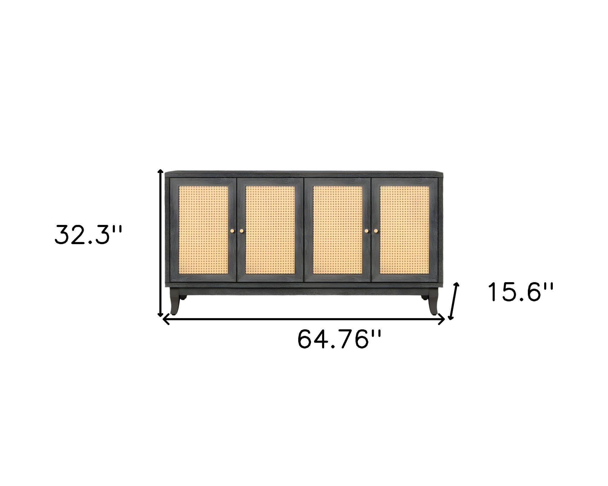 - Charming cabinet with charcoal gray/black wood, rattan paneled doors, adjustable shelf, and large surface tabletop.