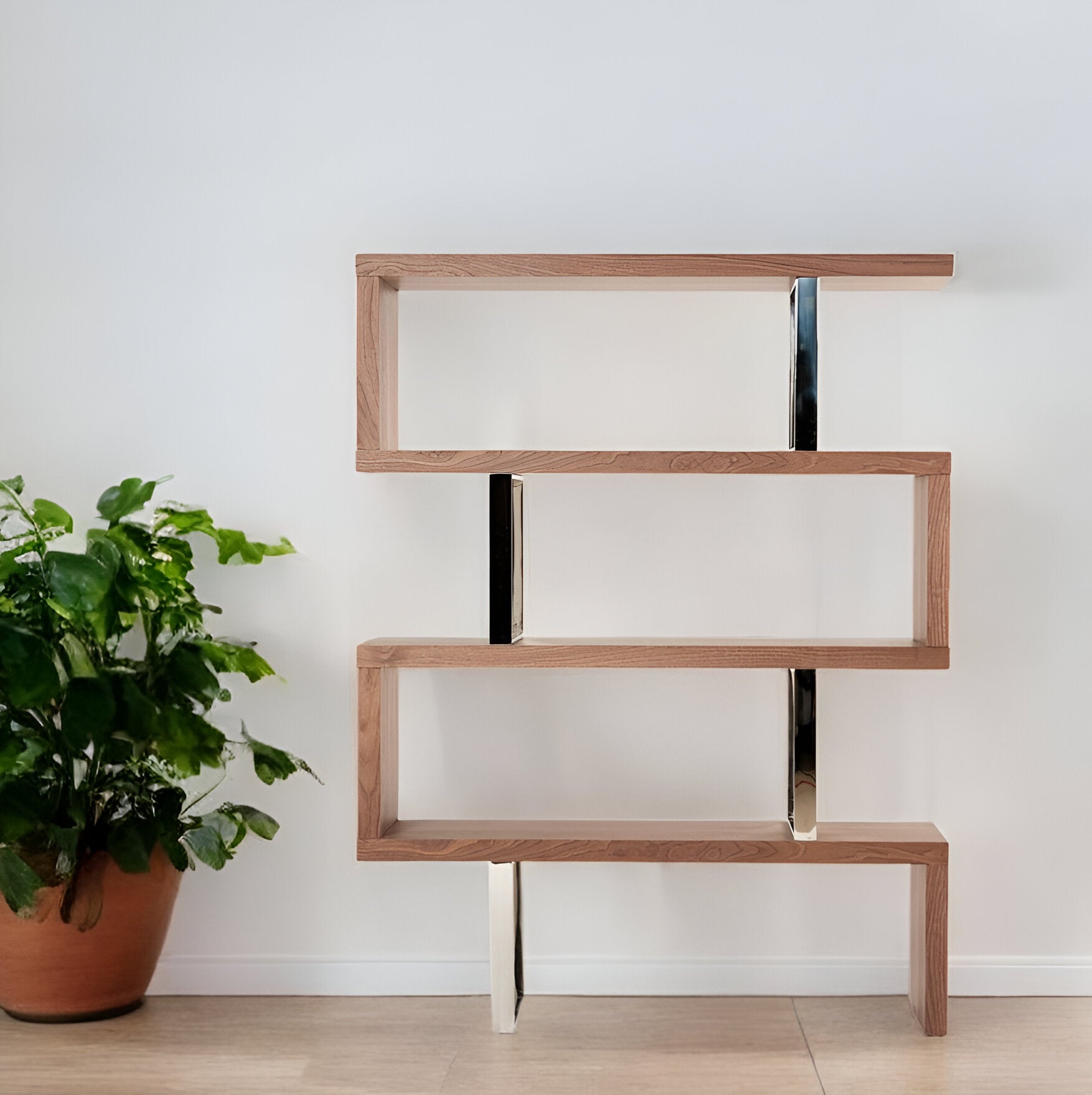 - Contemporary Zig Zag Shape Walnut Brown Veneer and Chrome Open Shelf Bookcase.